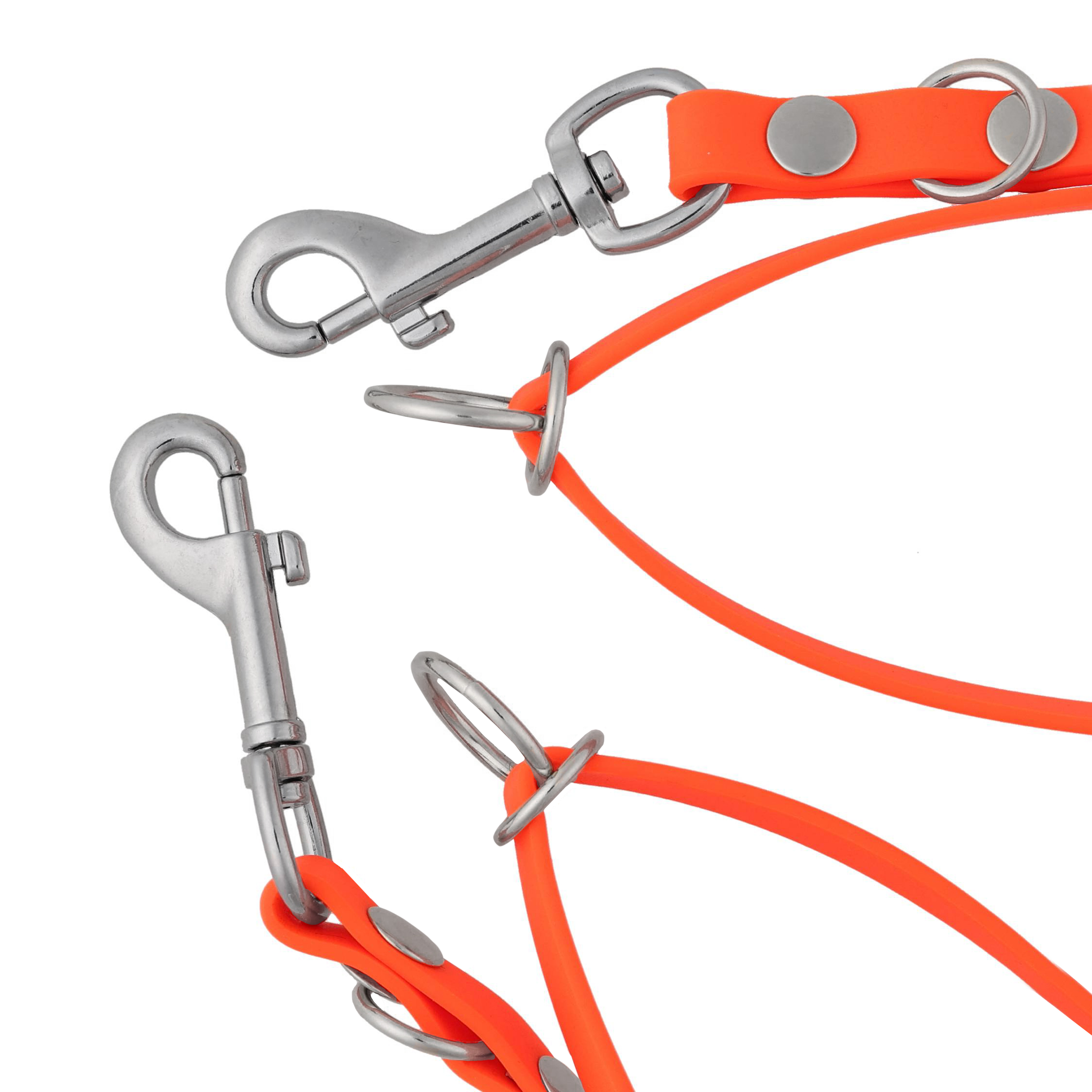Długość smyczy regulujemy za pomocą metalowych o-ringów i metalowych karabińczyków. Zaczepy mają chromowane wykończenie, które nie wywołuje reakcji alergicznych.