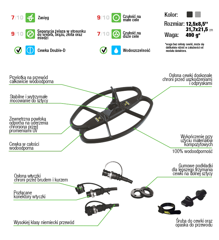 Cewka Nel Hunter 12,5×8,5" jest zaprojektowana tak aby sprostać poszukiwaniom na mocno zaśmieconym terenie. Cewka jest niezwykle lekka jak na swój rozmiar, tylko 490 g, dzięki czemu można z nią chodzić nawet cały dzień! Cewka ma doskonałą manewrowość i sprawdza się przy dużych, średnich i małych celach, zwłaszcza na gruntach silnie zaśmieconych żelazem. Zaleca się, jako zamiennik dla standardowych cewek. Cewka ta jest zalecana do stosowania w otwartym terenie, korpus wypełniony żywicą epoksydową, dodatkowo pokryty powłoką ochronną. Doskonale radzi sobie w warunkach wysokiego i średniego zasolenia gleby, jest w pełni wodoodporna co umożliwia poszukiwania w wodzie. Zalecana dla profesjonalistów i amatorów.