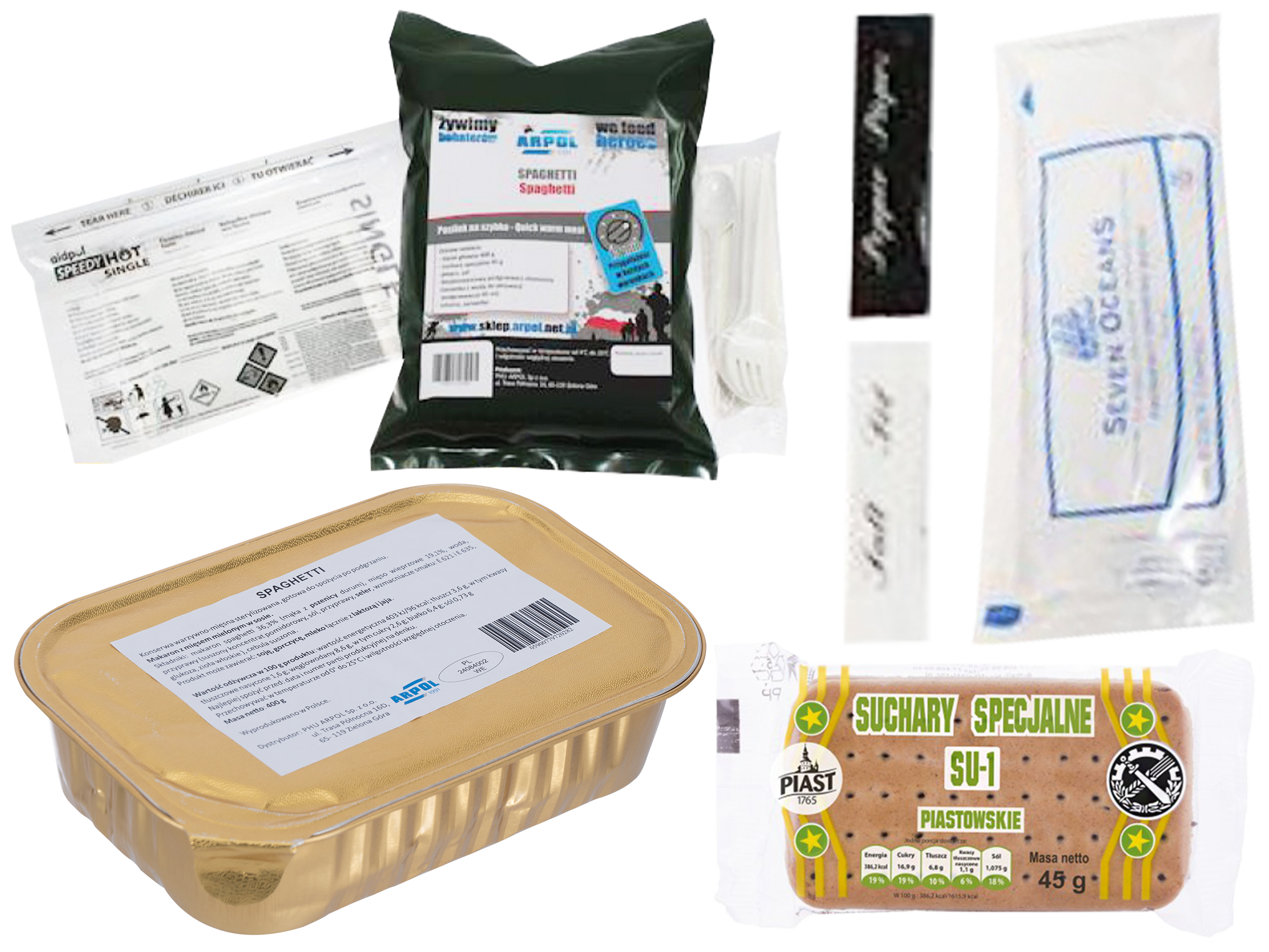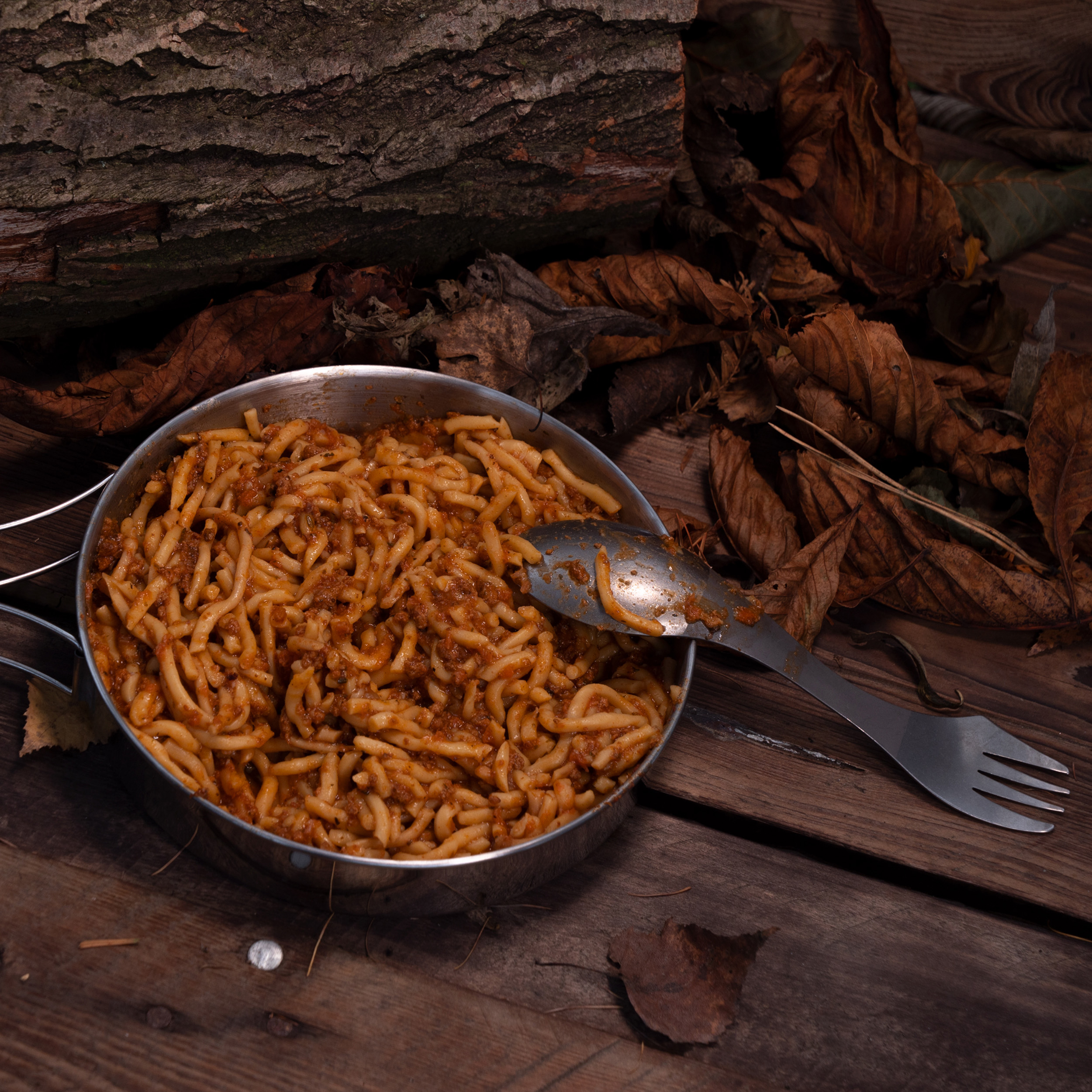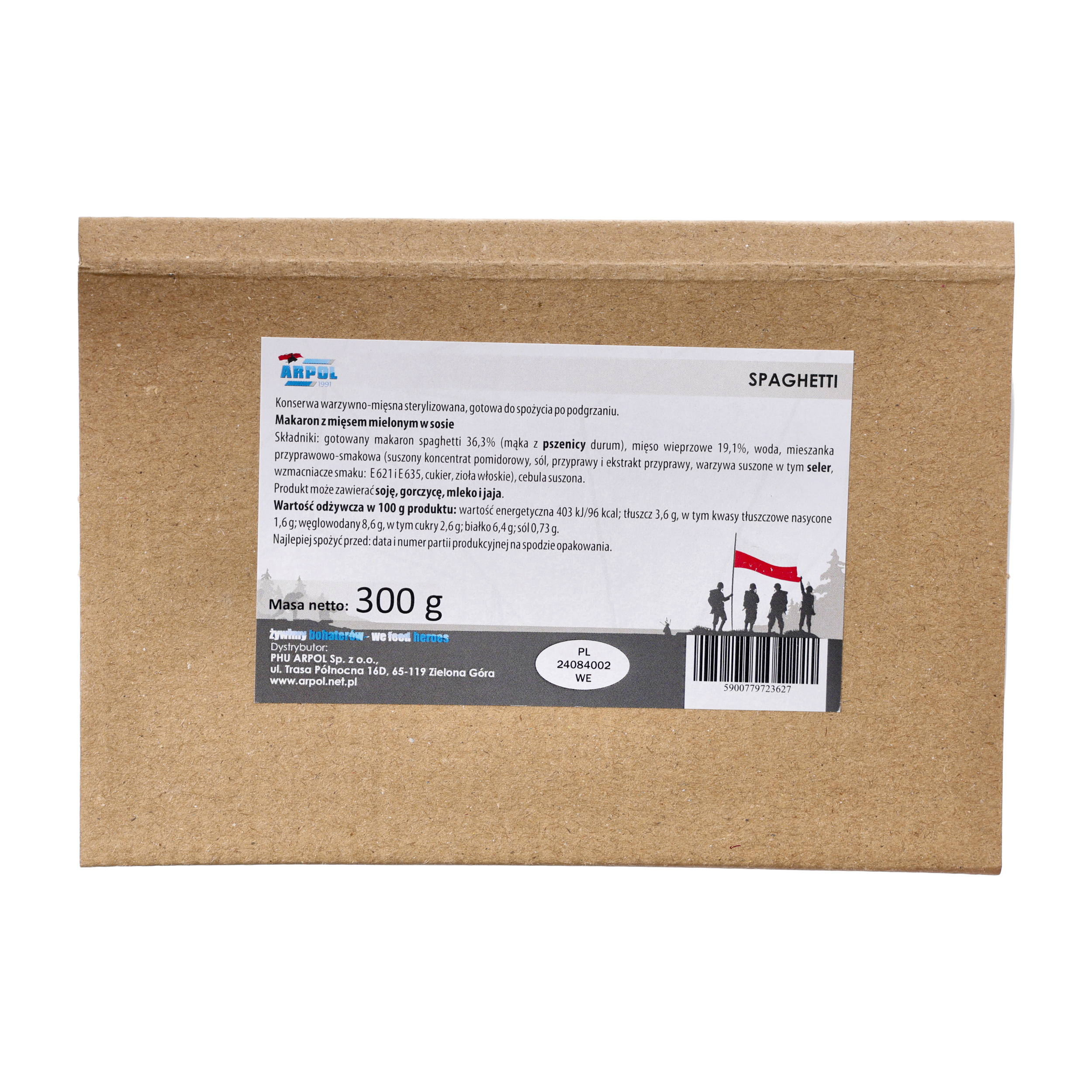 Spaghetti Arpol 300 g to wojskowe danie obiadowe dla jednej osoby, które można podgrzewać bezpośrednio w menażce, w wodzie lub żarze ogniska.