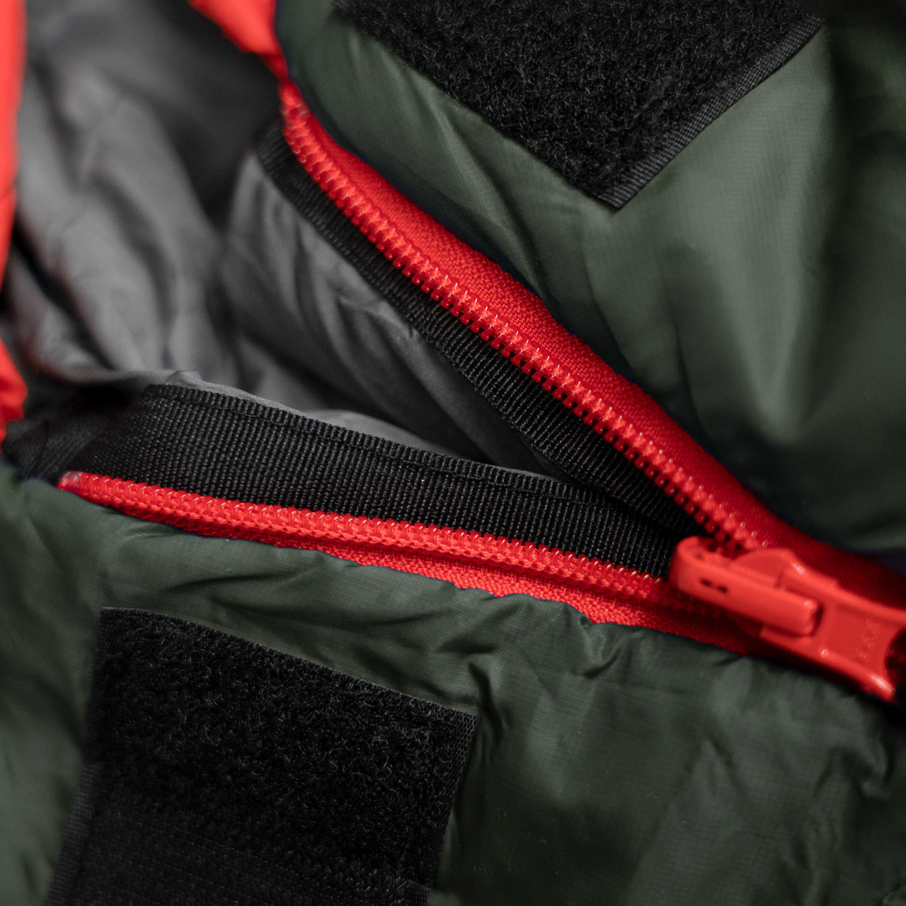 Zamek śpiwora jest wyposażony w praktyczną osłonę zamykaną oraz stoper, które zapobiegają przypadkowemu rozsuwaniu się śpiwora podczas snu. Wytrzymałe zamki dwukierunkowe YKK pozwalają na rozpięcie śpiwora również od dolnej części, co jest przydatne w przypadku chęci obniżenia temperatury wewnątrz w cieplejszych nocach.