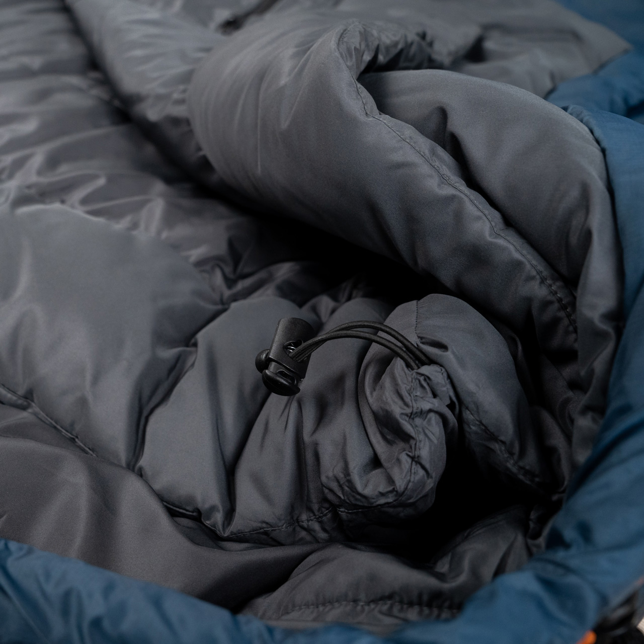 Zamek śpiwora jest wyposażony w praktyczną osłonę zamykaną oraz stoper, które zapobiegają przypadkowemu rozsuwaniu się śpiwora podczas snu. Wytrzymałe zamki dwukierunkowe YKK pozwalają na rozpięcie śpiwora również od dolnej części, co jest przydatne w przypadku chęci obniżenia temperatury wewnątrz w cieplejszych nocach.