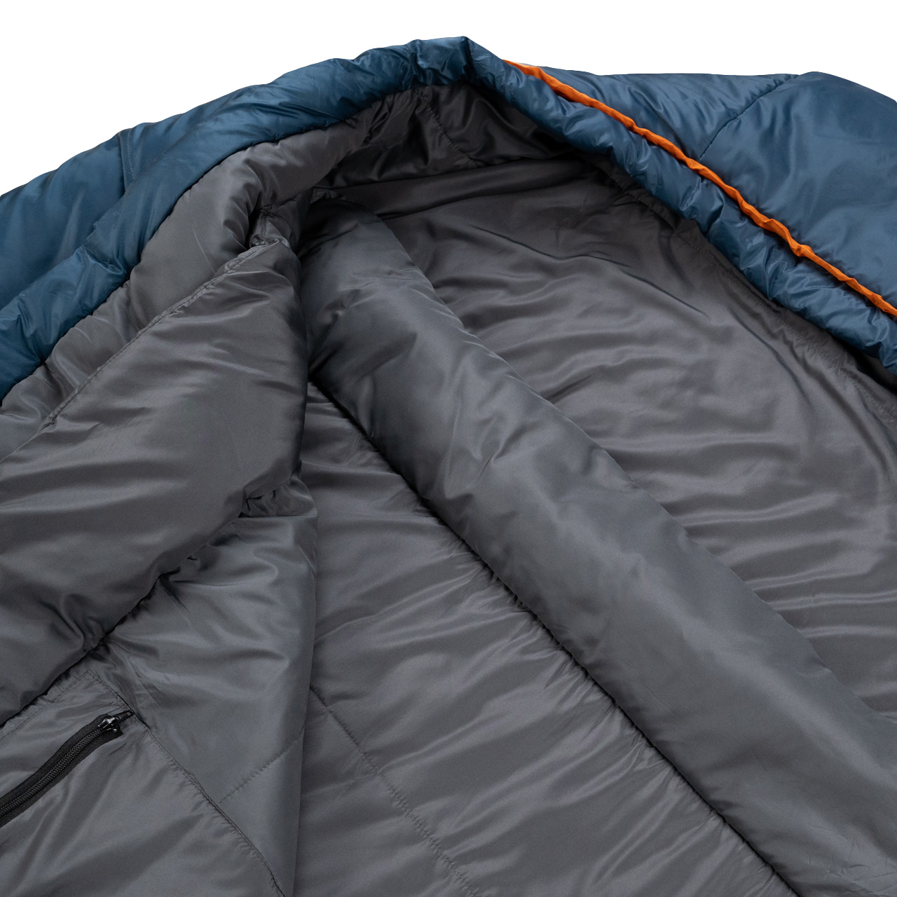 Wierzchnia warstwa śpiwora wykonana jest z wytrzymałego poliestru z technologią RipStop, która zwiększa jego trwałość i odporność na rozdarcie dzięki siatkowej strukturze przypominającej plaster miodu. Wewnątrz znajduje się miękka i przyjemna w dotyku podszewka, a także zamykana kieszonka na zamek, idealna do przechowywania drobnych kosztowności.