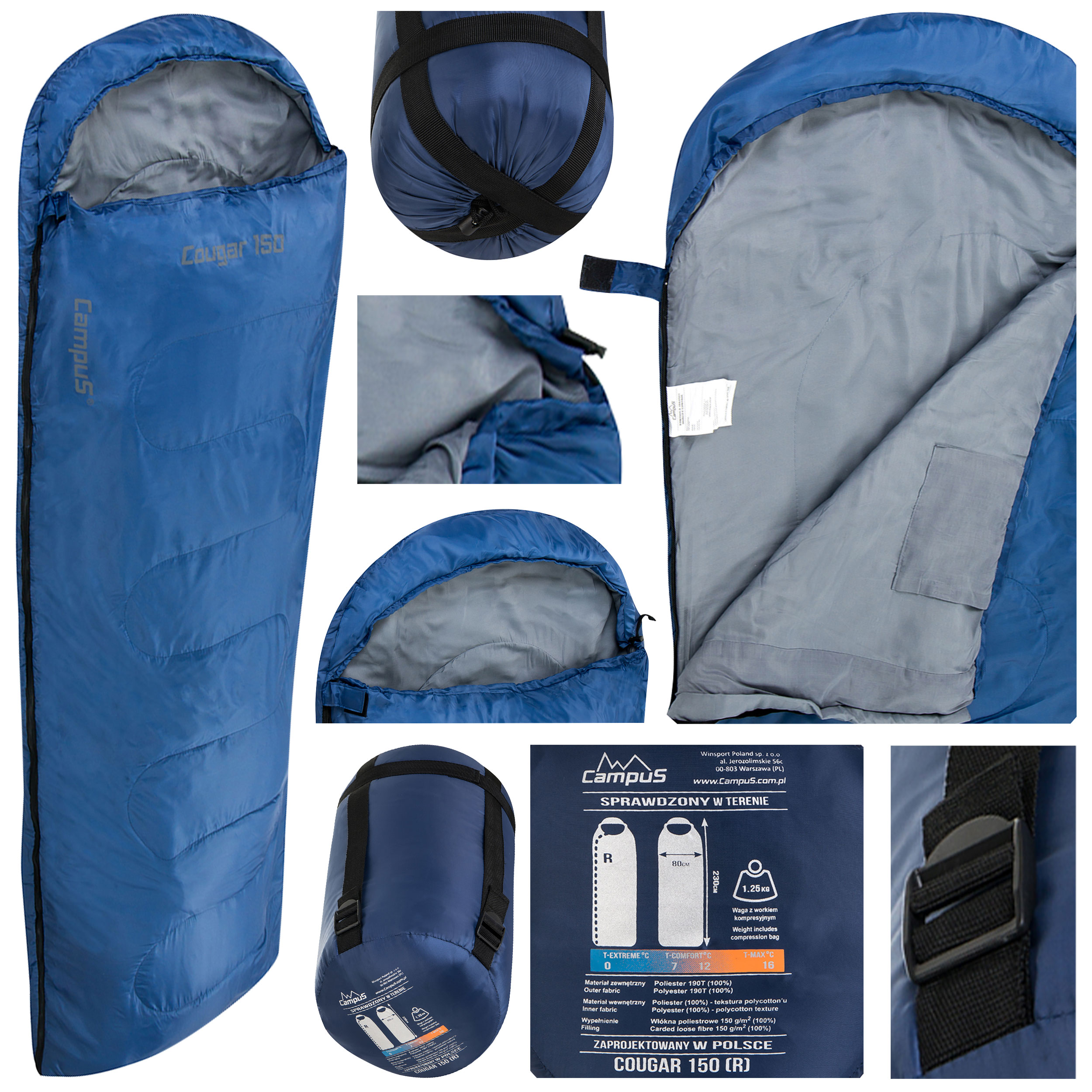 Campus Cougar 150 wyróżnia się dobrymi właściwościami termicznymi, wysoką jakością wykonania, zastosowaniem nowoczesnych technologii i materiałów m.in.: opatentowanego wypełnienia Hollowfiber oraz lekkich i wytrzymałych tkanin poliestrowych. Śpiwór ma dwukierunkowy zamek, umożliwiający rozpinanie także od dołu oraz system regulacji temperatury wewnątrz śpiwora. Dużym udogodnieniem jest system ANTI-BITE, który zapobiega wcinaniu się tkaniny w zamek. Komfort użytkowania zapewnia zamek rozpinany na całej długości dwóch boków. Po rozpięciu zamka śpiwór można łatwo przeistoczyć w standardową kołdrę. Do wygodnego przenoszenia Cougar 150 służy pokrowiec, z pasami kompresyjnymi, które ułatwiają zmniejszenie objętości śpiwora.
