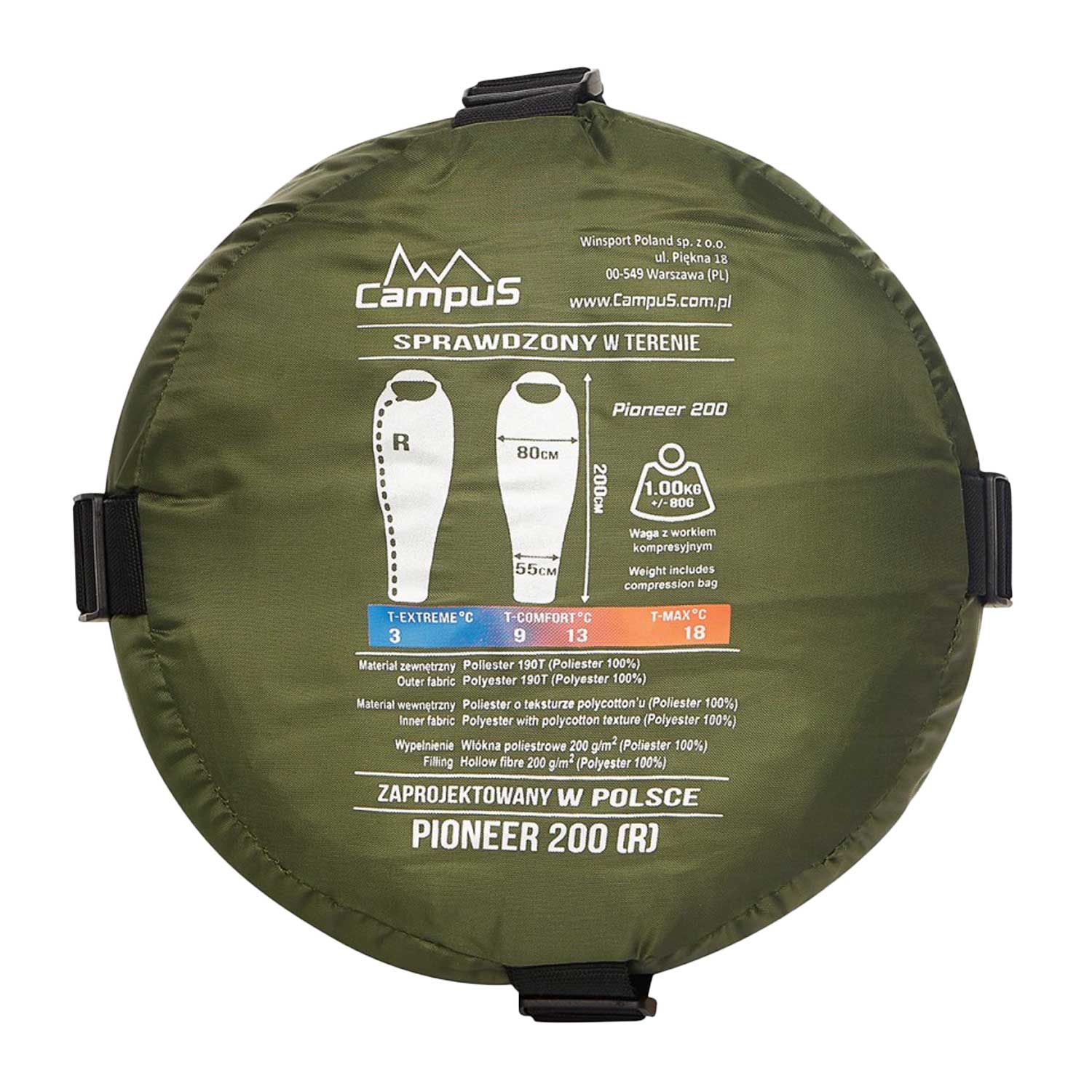 Model Campus PIONEER 200 to idealny śpiwór na letni treking lub biwak pod chmurką. PIONEER 200 wyróżnia się dobrymi właściwościami termicznymi, wysoką jakością wykonania, zastosowaniem nowoczesnych technologii i materiałów m.in.: opatentowanego wypełnienia Hollowfiber oraz lekkich i wytrzymałych tkanin poliestrowych. Śpiwór ma podwójny zamek (rozpinany od wewnątrz) oraz dodatkowy zamek w dnie pozwalający regulowanie temperatury wewnątrz śpiwora. Do wygodnego przenoszenia Hobo 150 służy pokrowiec, z pasami kompresyjnymi, które ułatwiają zmniejszenie objętości śpiwora. Wymiary śpiwora po skompresowaniu wynoszą 36 × 20 cm. Pozwala to na wygodnie przytroczenie go do plecaka turystycznego lub schowanie w jego wnętrzu bez znacznej utraty przestrzeni bagażowej.