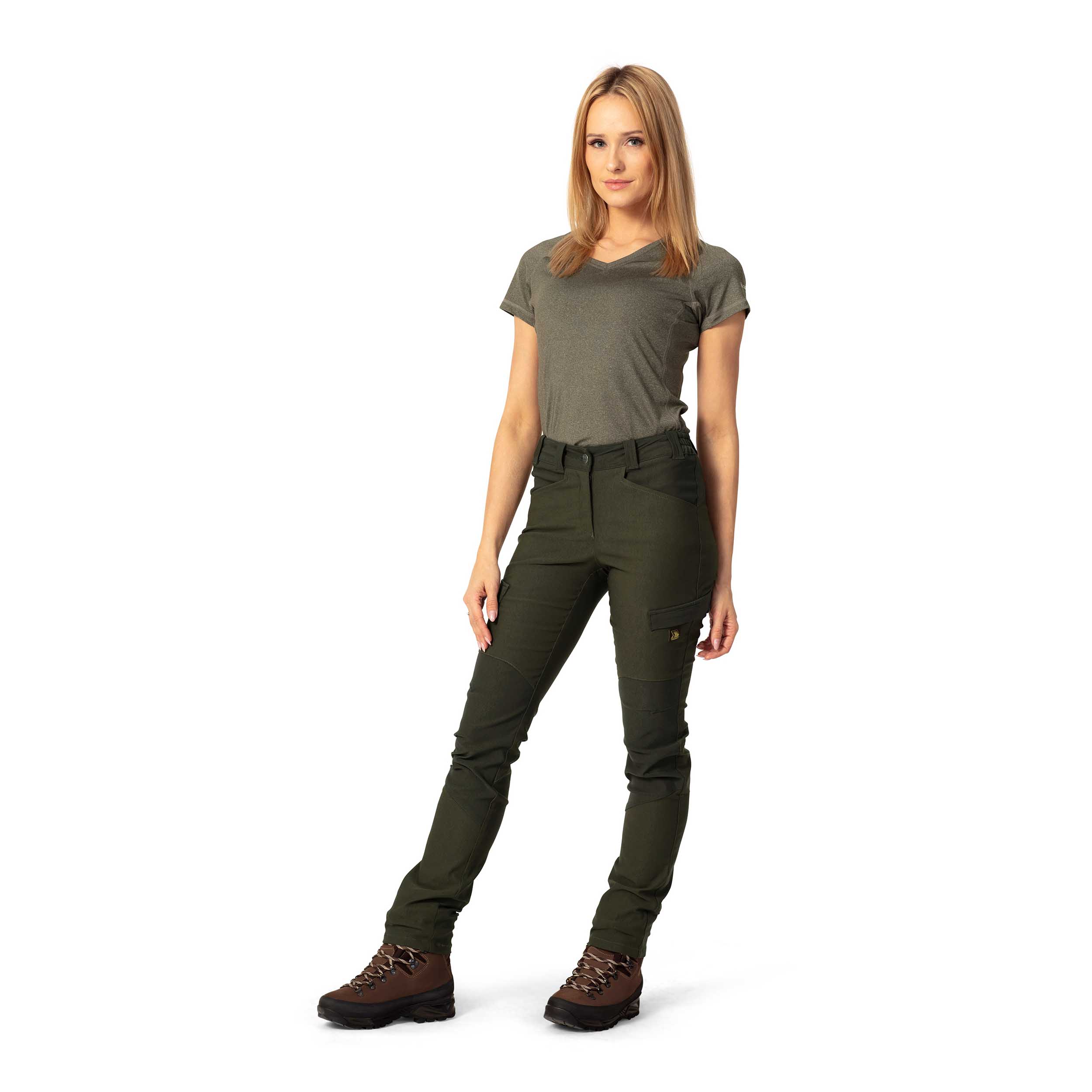 Spodnie damskie myśliwskie Tagart Cramp Pro w kolorze ciemnozielonym wykonane są z tkaniny o unikalnym składzie materiałowym. Łączy chłonność wiskozy, wytrzymałość poliamidu i sprężystość Spandexu. Jest bardzo elastyczny, dobrze dopasowując się do sylwetki. Praktycznie nie ogranicza swobody ruchów.