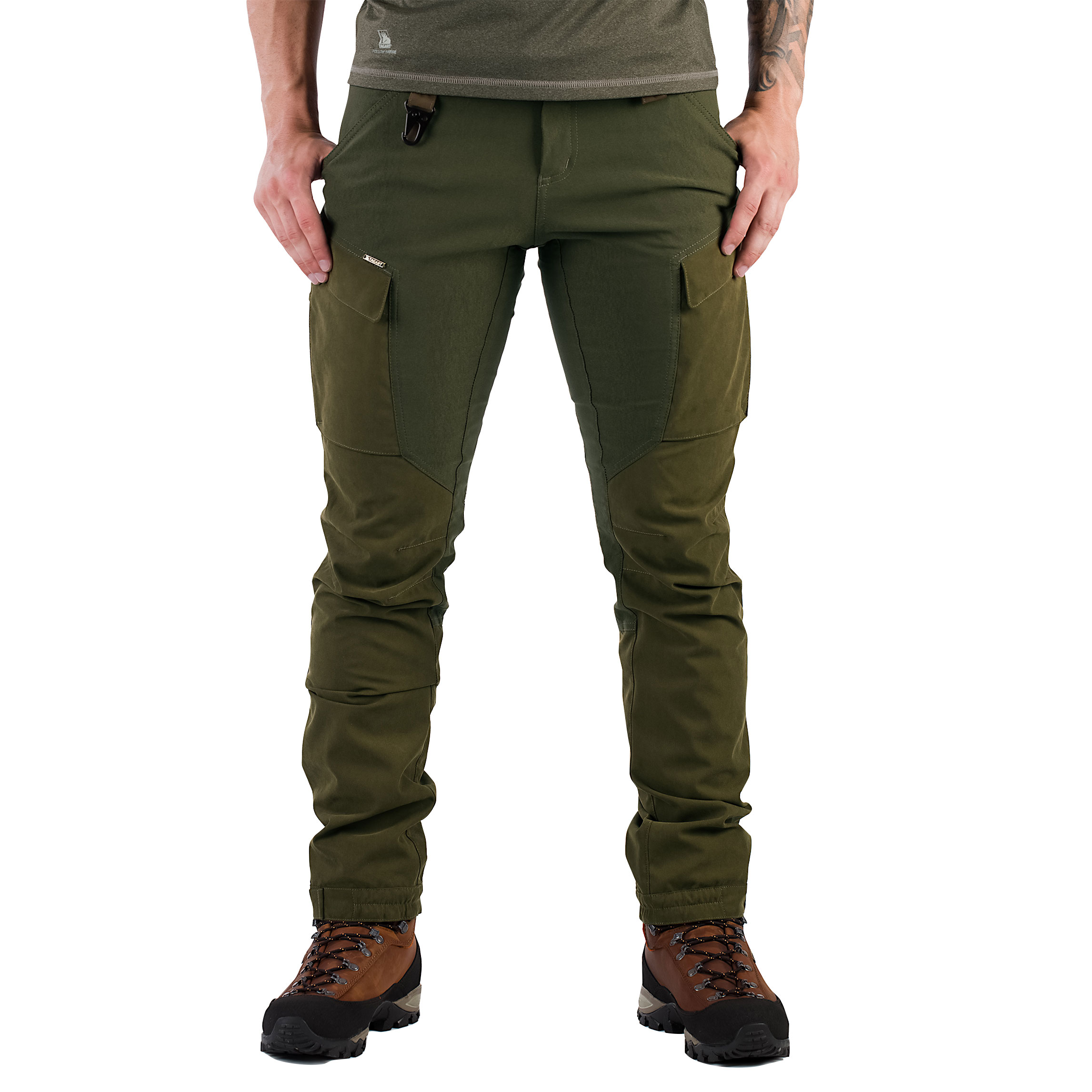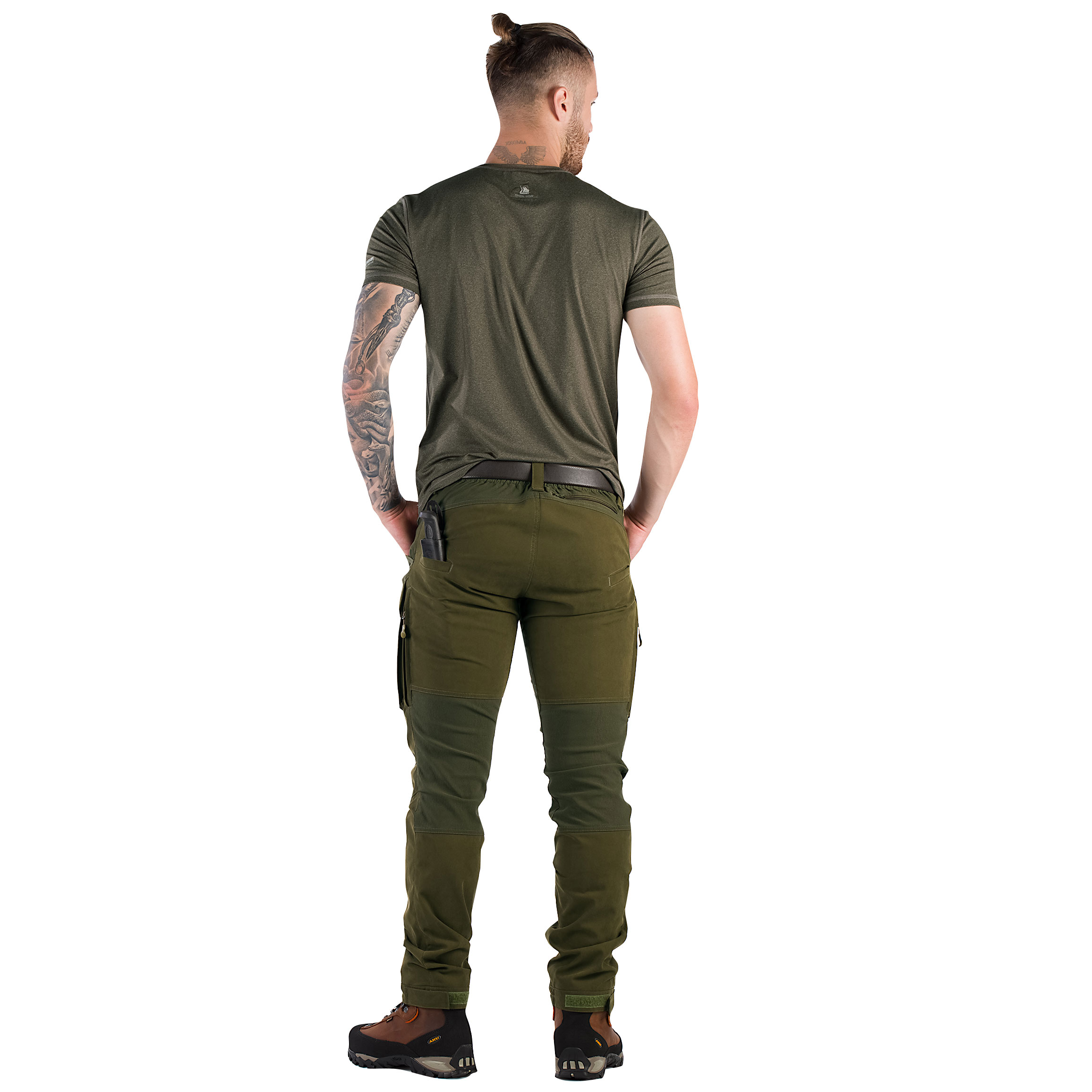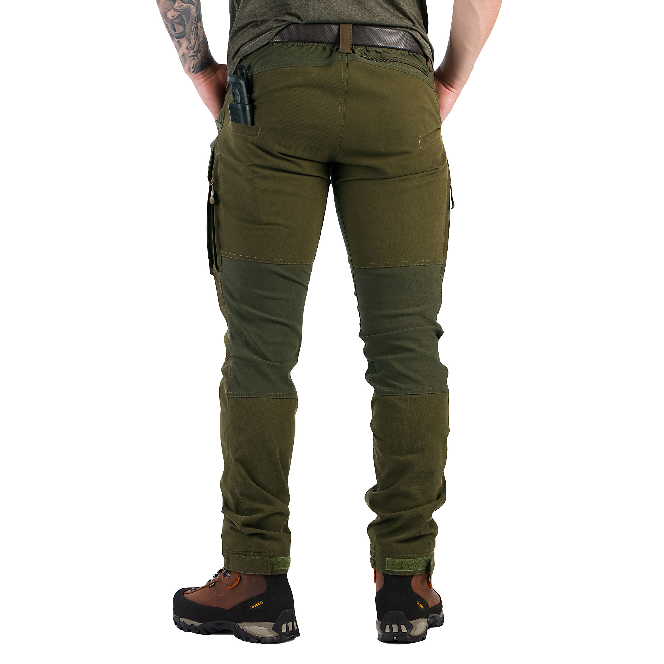 Guma wszyta w tylnej części spodni umożliwia dogodne dopasowanie, a klin wszyty pomiędzy udami sprawia, że spodnie prawidłowo przylegają do ciała, ale nie ograniczają swobody ruchów. Dzięki licznym funkcjonalnym kieszeniom bezpiecznie przetransportujesz wszystkie potrzebne przedmioty. Spodnie wyposażono w dwie specjalne kieszenie na latarką i nóż, dwie kieszenie górne, pięć kieszeni zapinanych (w tym dwie z funkcją wentylacji) oraz tylną kieszeń zapinaną na suwak. Kieszenie na udach zaopatrzone zostały w przedziały na telefon i ładownice na naboje.
