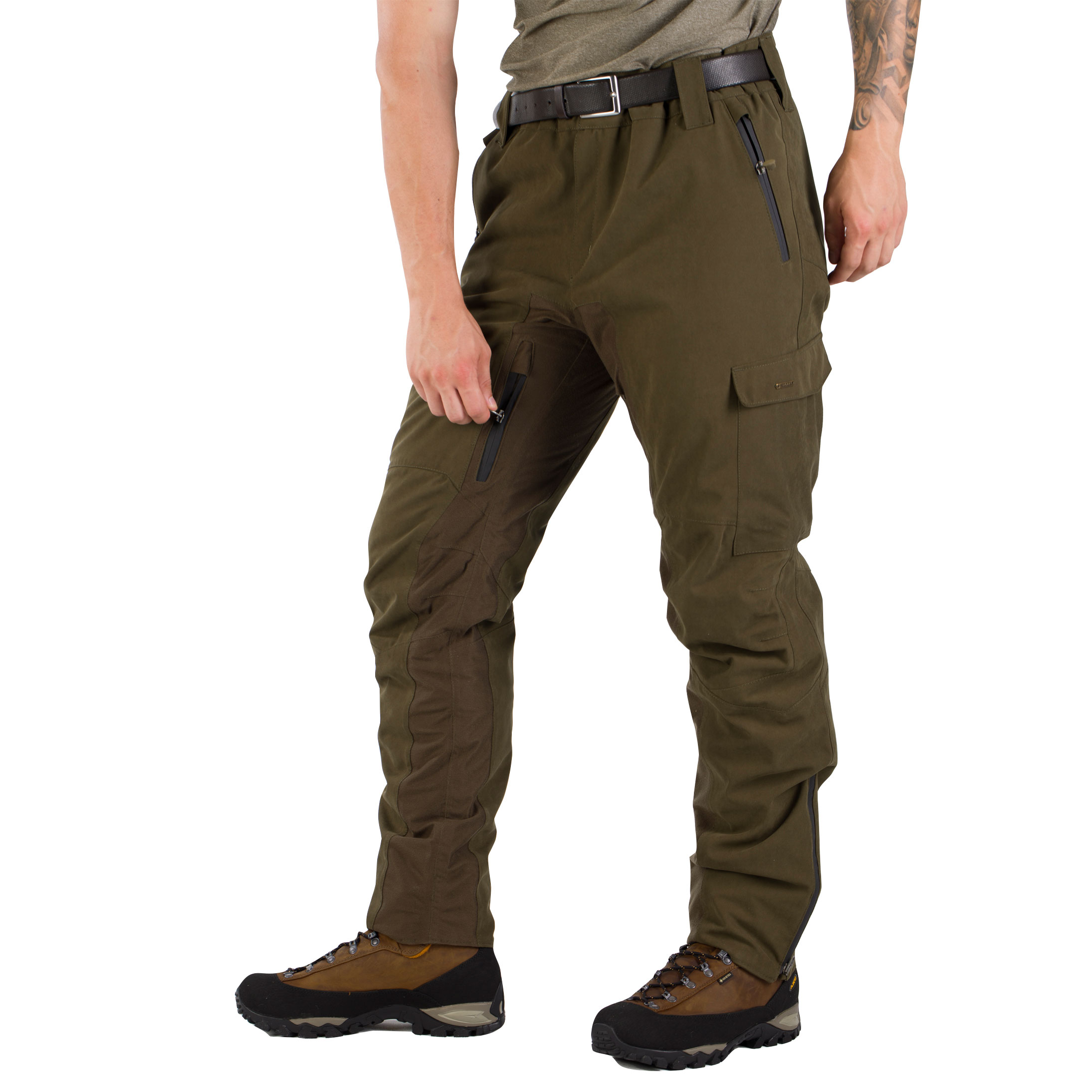 • Funkcjonalne kieszenie: dwie zasuwane kieszenie boczne, dwie pojemne kieszenie na udach oraz ładownica na siedem kul w prawej kieszeni.
