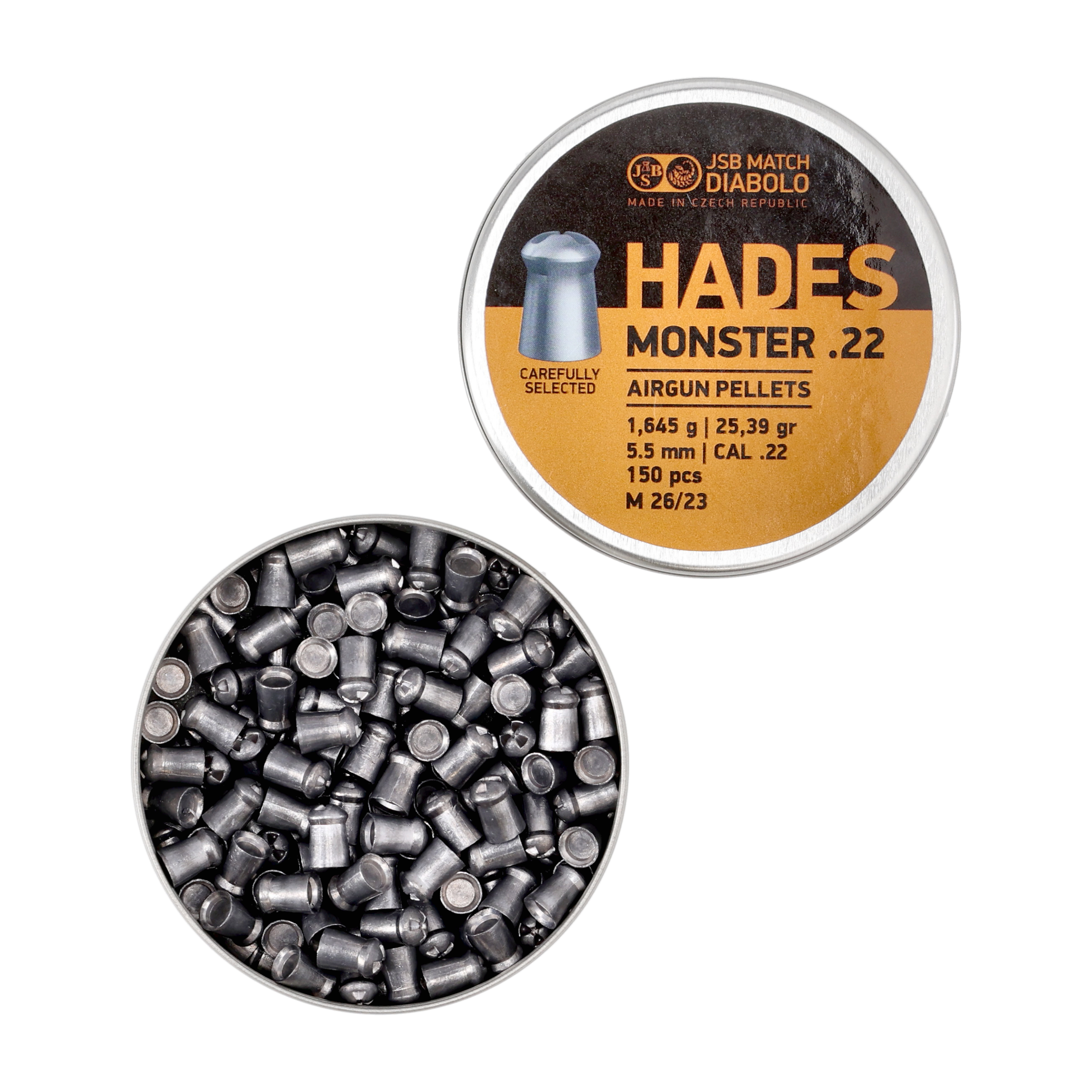 Zaokrąglony kształt główki śruciny zapewnia precyzyjne oddanie strzału. Jego dobre wyważenie i charakterystyczny kształt gwarantuje stabilny tor lotu. Natomiast potrójne nacięcie umożliwia całkowite spłaszczenie i oddanie całej energii kinetycznej. Został on stworzony z myślą o mocnych karabinach, ponieważ jest on niezwykle skuteczny na średnich i dużych dystansach. Śrut Diabolo Hades Monster marki JSB odznacza się dużą mocą obalająco-penetrującą. Jest on skuteczny również w czasie wietrznej pogody.