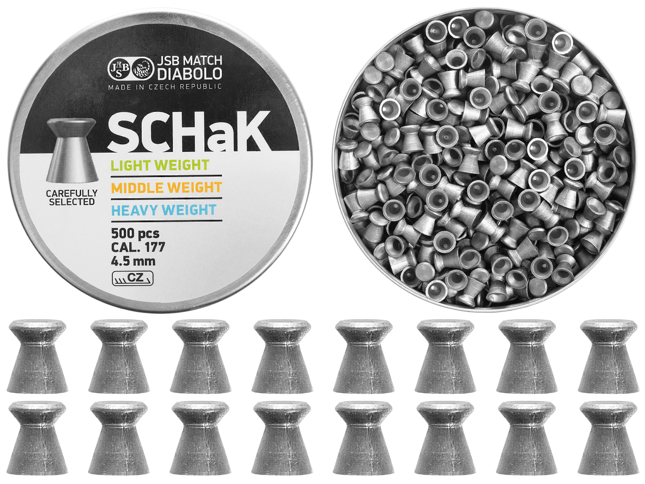 Diabolo SCHAK, śrut do pistoletu oraz do karabinu czeskiego producenta firmy JSB. Płaski i gładki śrut w kalibrze 4.5 mm, przeznaczony do strzelania tarczowego oraz do treningu na krótkich i średnich dystansach.