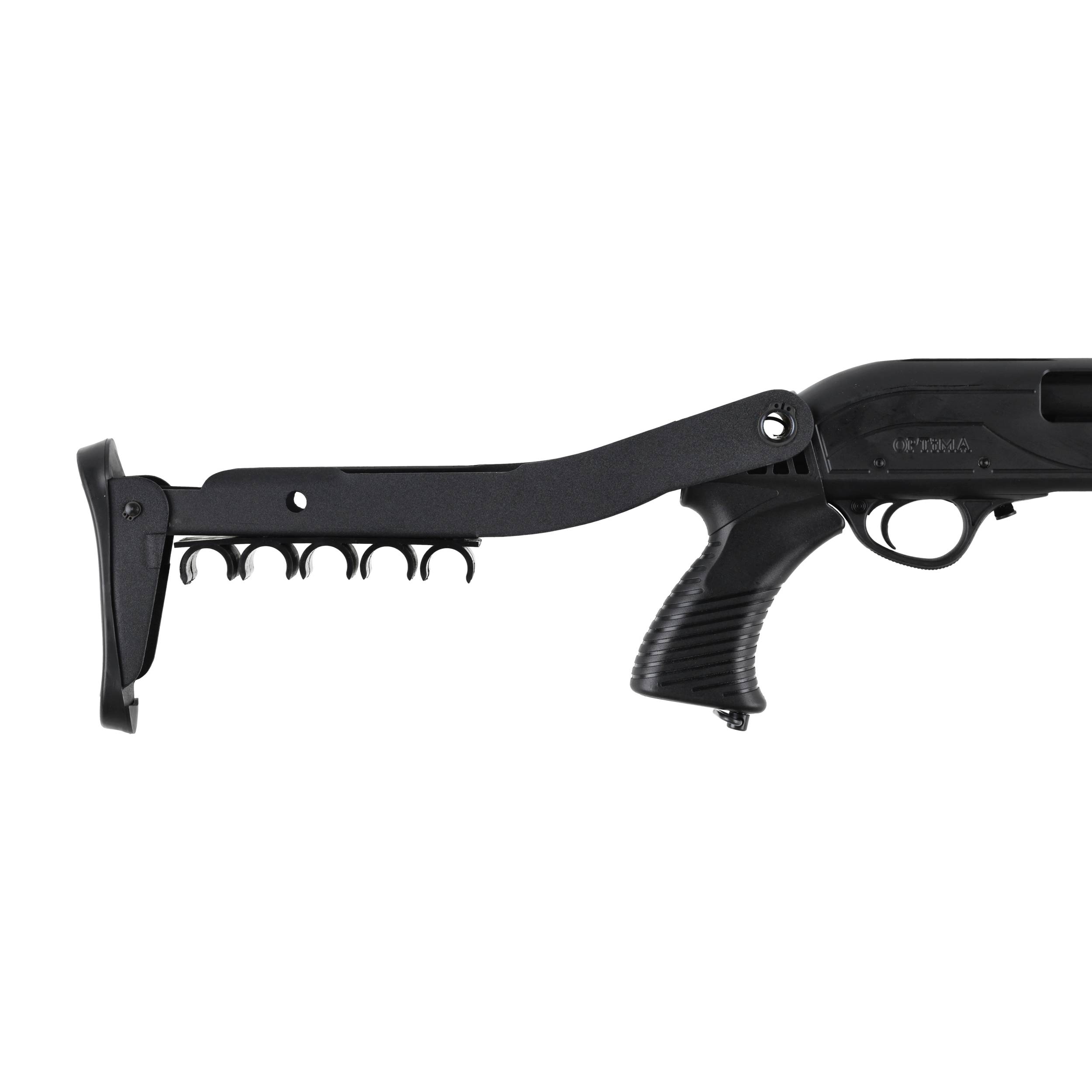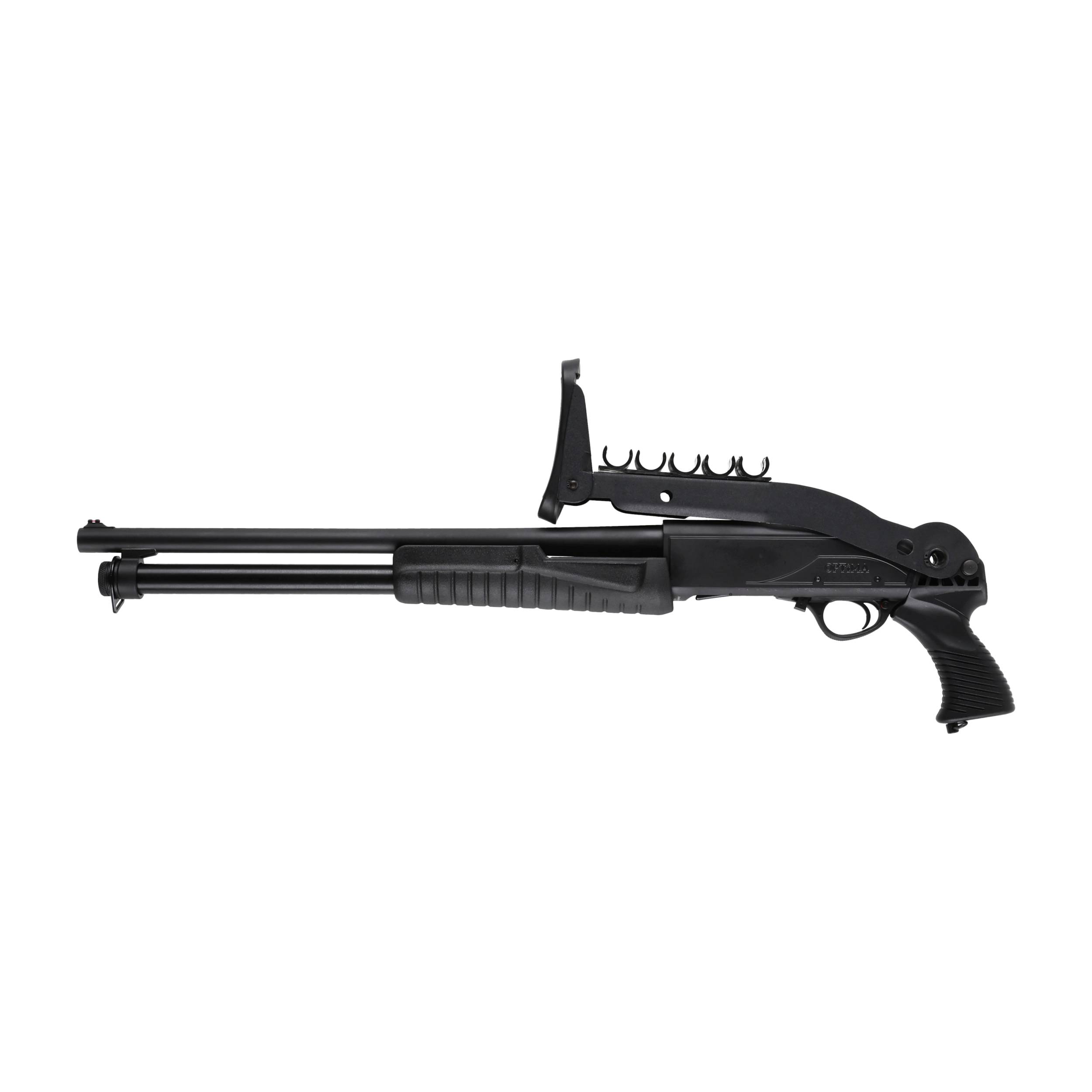 Broń wykorzystuje polimerową osadę, która z uwagi na swoją niską masę oraz wysoką wytrzymałość doskonale sprawdzi się w strzelectwie dynamicznym. Pokryte intensywnym teksturowaniem czółenko trzyma się powierzchni naszej dłoni, niezależnie czy jest ona mokra, brudna czy odziana w rękawice. Wyróżnikiem wersji TFS jest składana na grzbiet broni kolba. Ułatwi nam to zarówno transport, jak i manewrowanie bronią w bardzo ciasnych przestrzeniach. Co więcej, na kolbie umieszczono uchwyty na 5 sztuk nabojów.
