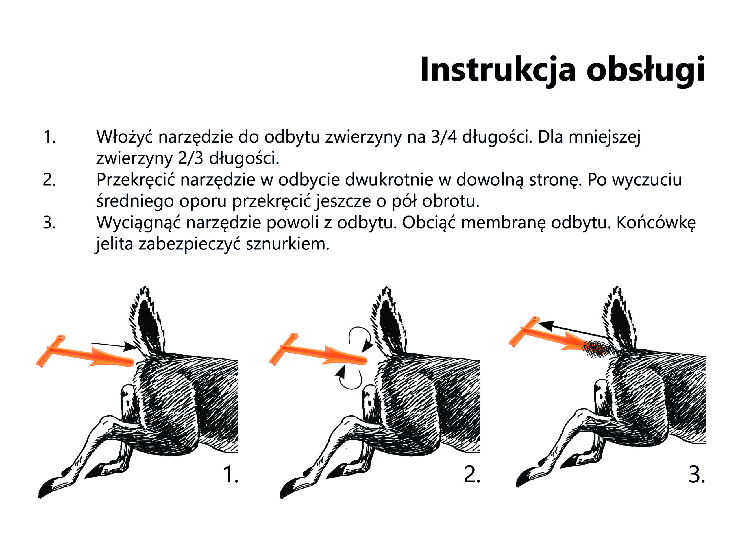 Narzędzie należy włożyć w odbyt trzymając za rączkę. W zależności od wielkości tuszy do mniejszych zwierząt na 2/3 długości do sarny, średni dzik lub prawie do końca przy jeleniu. Przekręcić w dowolną stronę pełne dwa obroty do wyczucia średniego oporu. Następnie jeszcze o pół obrotu (zrywanie błon) i powoli wyciągnąć odbyt na około 10-15cm. Jeżeli wyciągniemy ponad 25cm jelito może się urwać. Obciąć flak. Dla czystości tuszy zawiązać koenic jelita kawałkiem sznurka.
