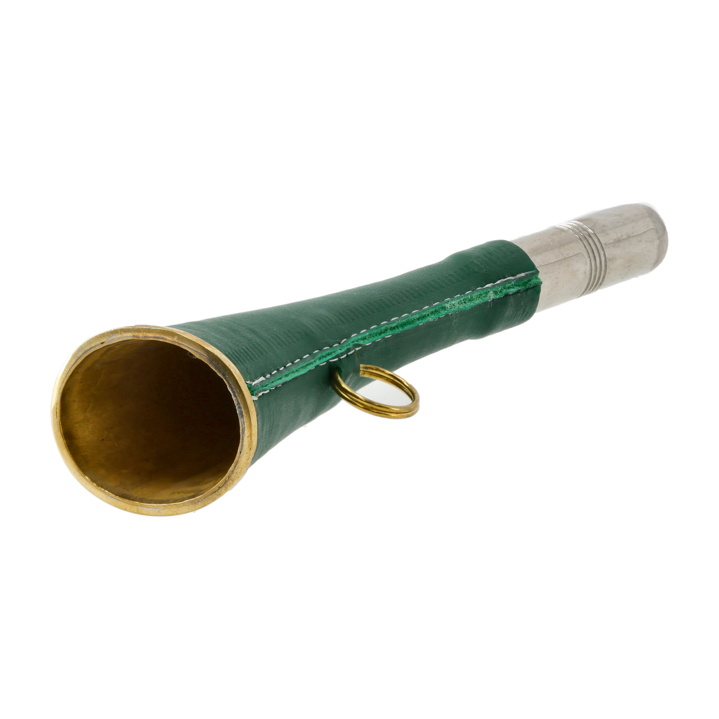 Sygnałówka gięta to wysokiej jakości myśliwska trąbka sygnalizacyjna powstała w Pakistanie z mosiądzu, który następnie został owinięty w ekologiczną skórę koloru zielonego.