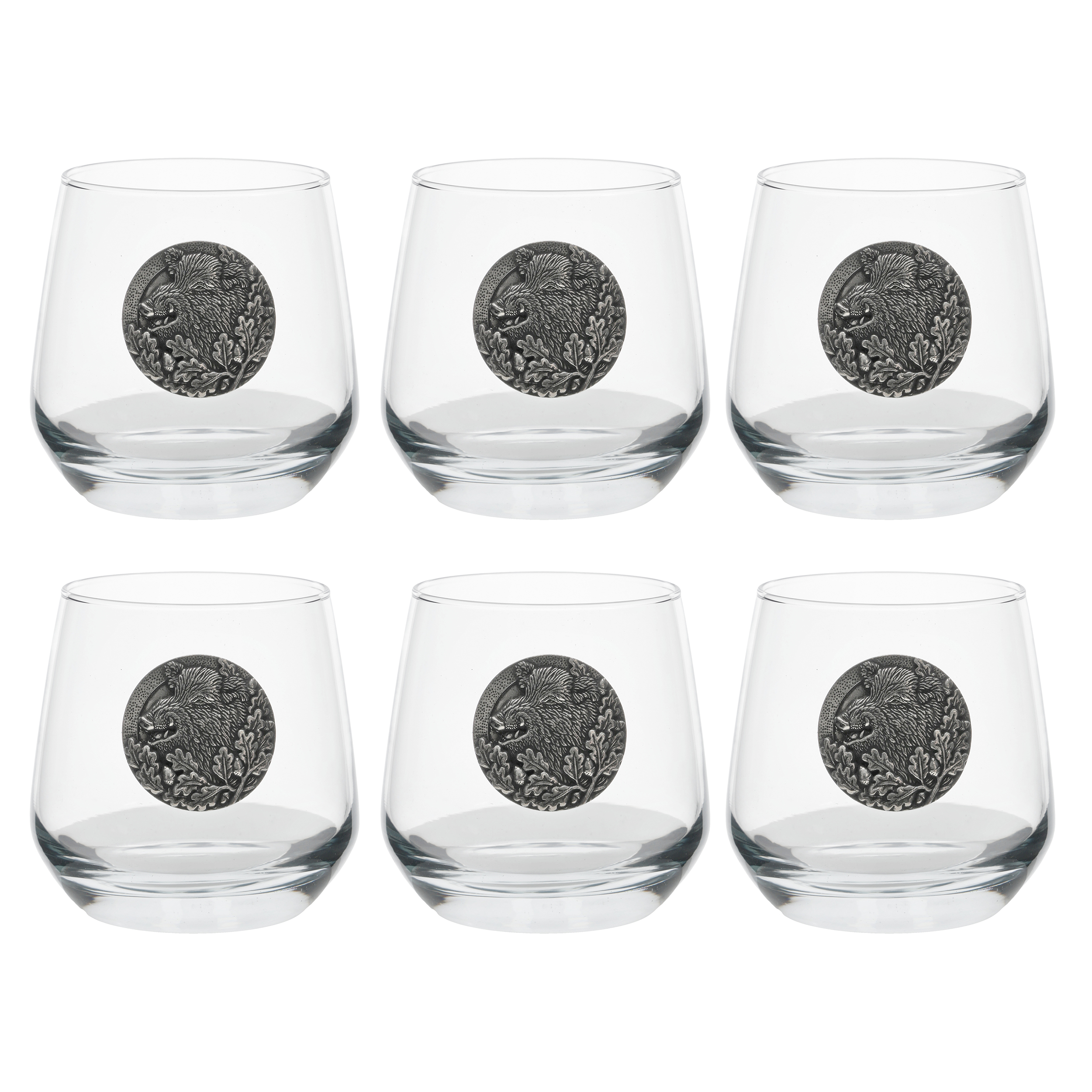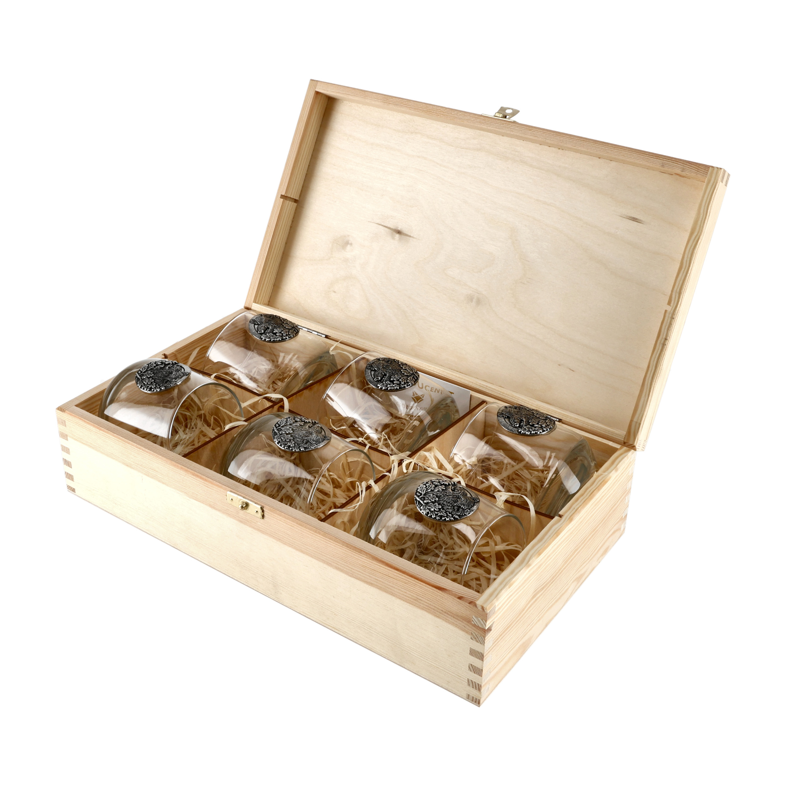 Komplet składa się z 6 owalnych szklanek, które zdobią mosiężne tabliczki z wizerunkiem samca dzika. Ten zestaw ekskluzywnych szklanek pakowany jest w drewniane pudełko. Będzie to znakomity prezent dla leśnika, myśliwego oraz każdego dorosłego zwolennika mocniejszych trunków.