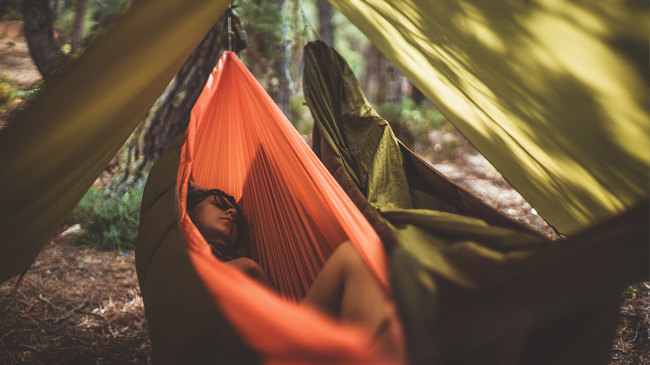 Jesień – Wietrzne warunki, możliwość opadówW takich warunkach rozwieś tarp niżej, bliżej hamaka. Odciągi zamontuj szeroko, aby wiatr prześlizgiwały się po tarpie i nie napierał nadmiernie na jego boki.