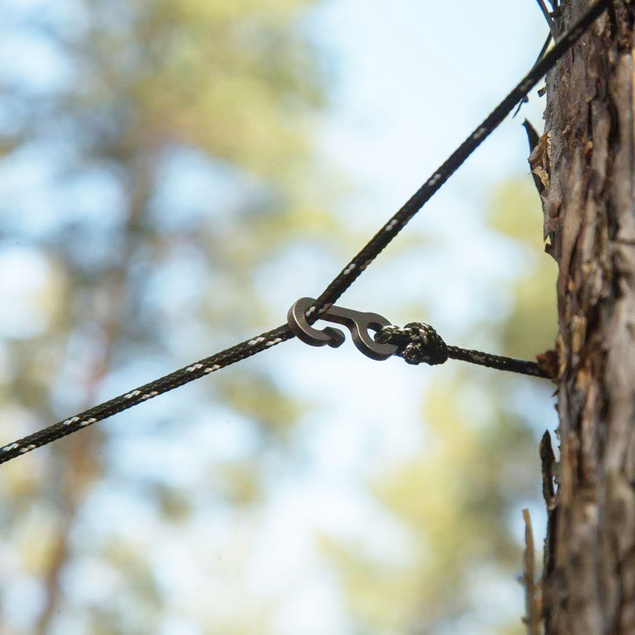 Łatwość montażu tarpa zapewnia zintegrowany mechanizm napinania linek. System zawieszenia jest prosty i można go łatwo obsługiwać jedną ręką, w dodatku bez znajomości węzłów. Wystarczy zamocować linkę do podłoża i naciągnąć. Regulator napięcia linki automatycznie blokuje ją i zapobiega jej luzowaniu. Odciągi grzbietowe mają mini haczyki, dzięki czemu mocowanie tarpa do drzew odbywa się bez konieczności stosowania węzłów. Do rozstawienia tarpa wymagane jest użycie 4 śledzi (brak w zestawie).