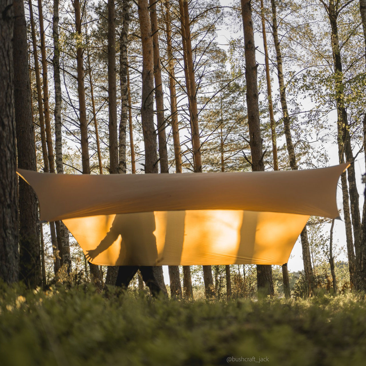 Lesovik HEKSA to specjalistyczny tarp o sześciokątnym kształcie stworzony z myślą o biwaku hamakowym.
