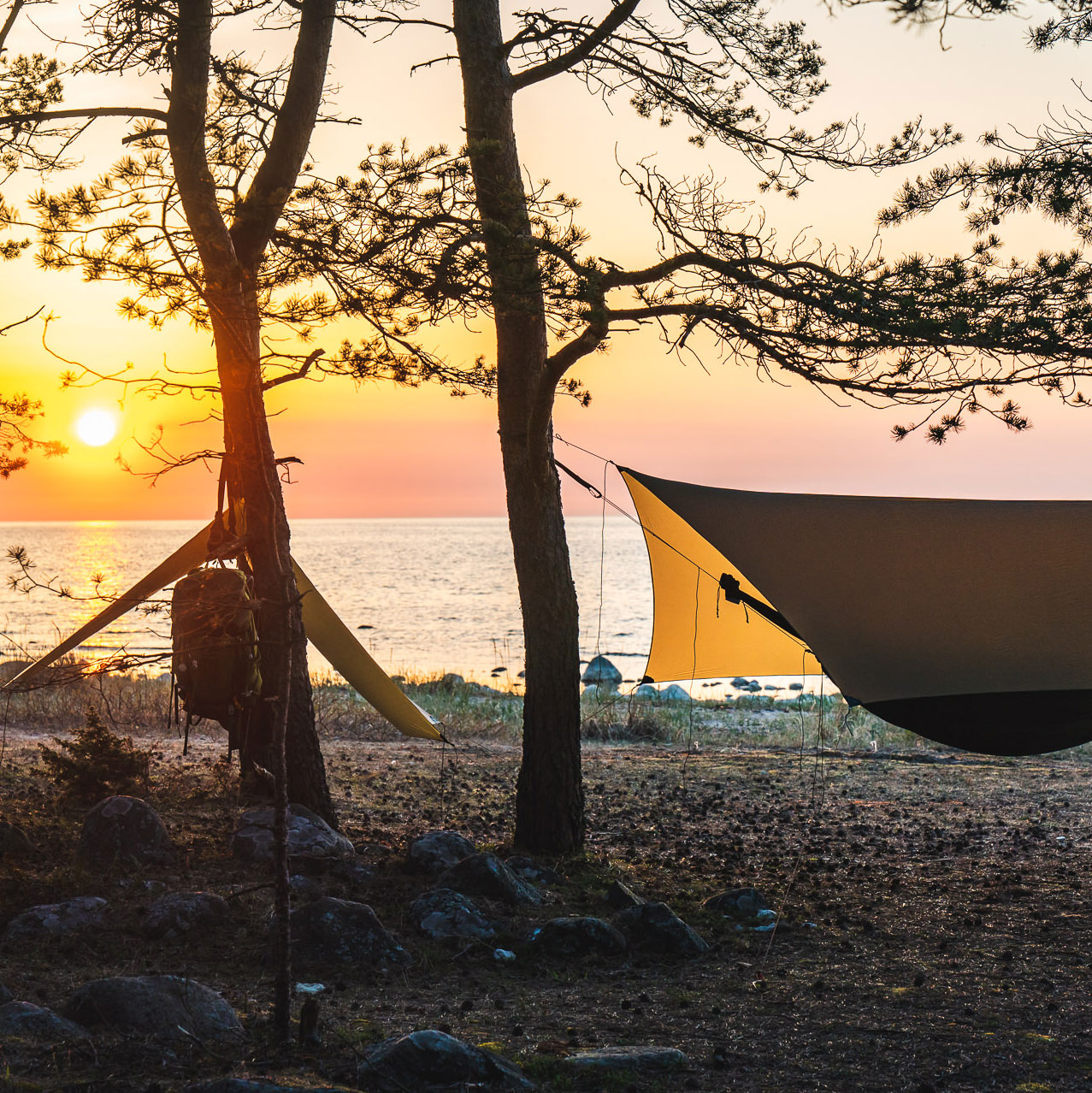 Dzięki gaszonej kolorystyce tarp HEKSA łatwo wtapia się w leśne środowisko, dlatego nasz nocleg nie przyciąga uwagi. Wymiary HEKSA 360 × 300 cm zapewniają wystarczającą przestrzeń do obozowania, odpoczynku i noclegu nawet dla kilku osób. Pod tarpem można schronić się przed pogodą, przepakować plecak, przygotować posiłek i spokojnie się wyspać. Duża powierzchnia płachty sprawia, że pod tarpem bez problemu zmieścimy standardowy hamak np. Lesovik DRAKA.