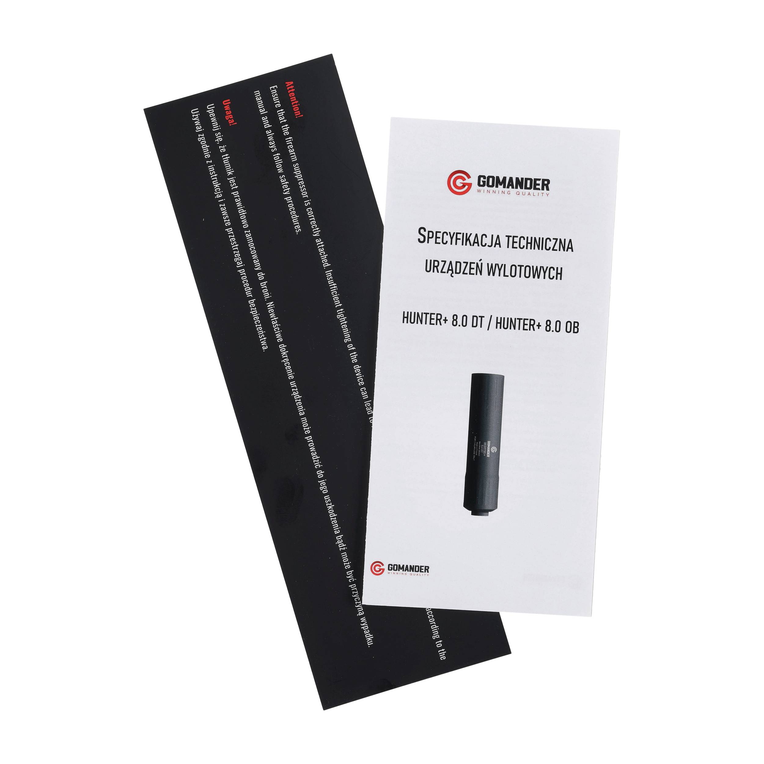 Tłumik do broni myśliwskiej Gomander Hunter 8.0 DT Generacji II to skuteczne urządzenie wytłumiające dźwięk strzału, nakręcane na gwint u wylotu lufy (Direct Thread). Stworzony został specjalnie do współpracy z bronią myśliwską, gdzie ogranicza płoszenie zwierzyny. Tłumik wykonano z lekkiego aluminium lotniczego, co przekłada się na niską masę oraz dobre przewodnictwo cieplne (szybsze schładzanie). Dodatkowe pokrycie powierzchni tłumika powłoką ochronną Cerakote zapewnia zabezpieczenie przed niekorzystnym wpływem kwaśnego środowiska tworzonego przez resztki prochu. Najważniejszym jest w konstrukcji system redukujący powracanie gazów prochowych z powrotem do komory nabojowej oraz w stronę strzelca. Tłumik jest też dzięki temu łatwy w czyszczeniu. Model jest w kolorze czarnym i dostosowany jest do gwintu 14 × 1.