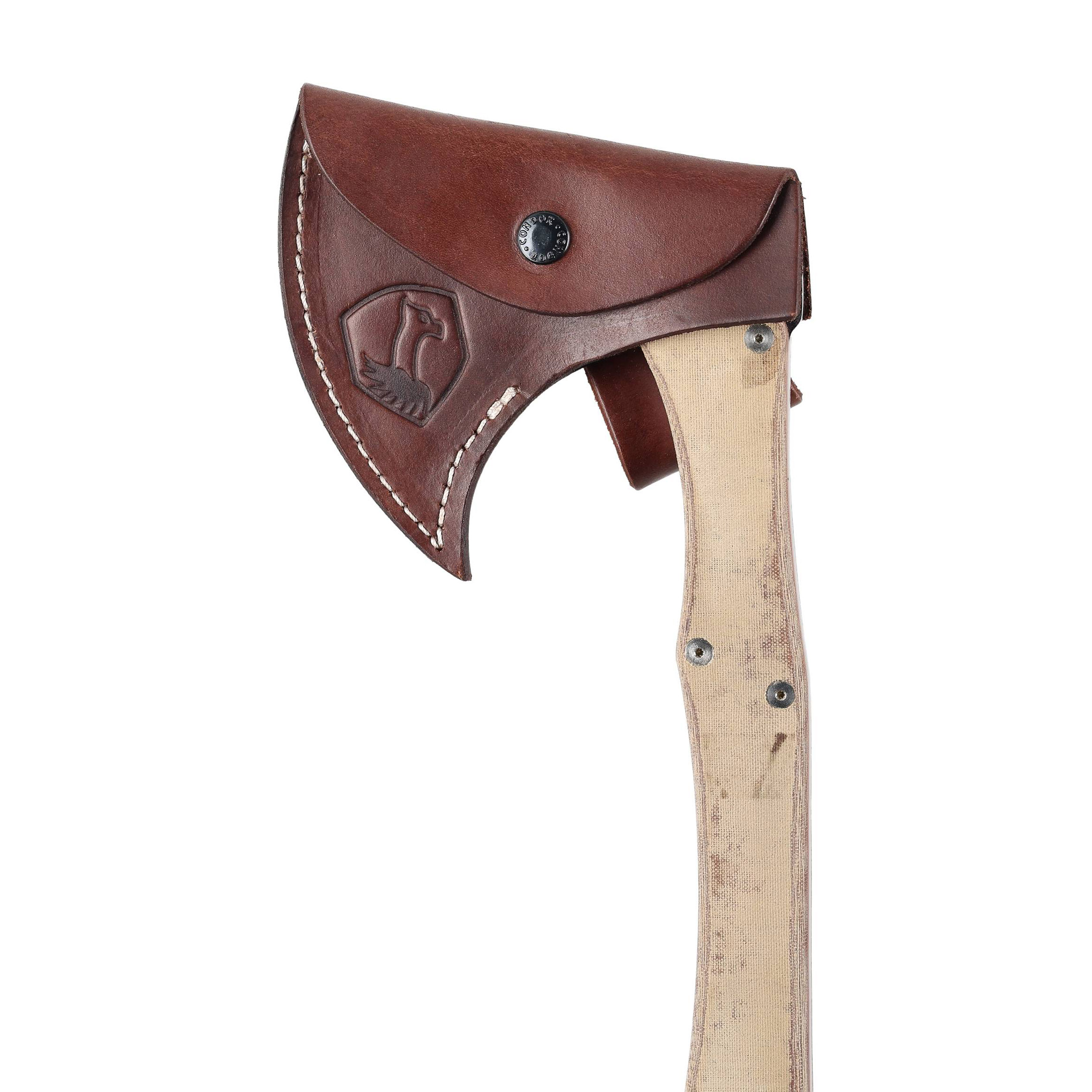 Toporek Mountain Pass dostarczany jest wraz z ręcznie wykonaną skórzaną pochewką w kolorze brązowym, która skutecznie zabezpiecza narzędzie w trakcie przenoszenia.