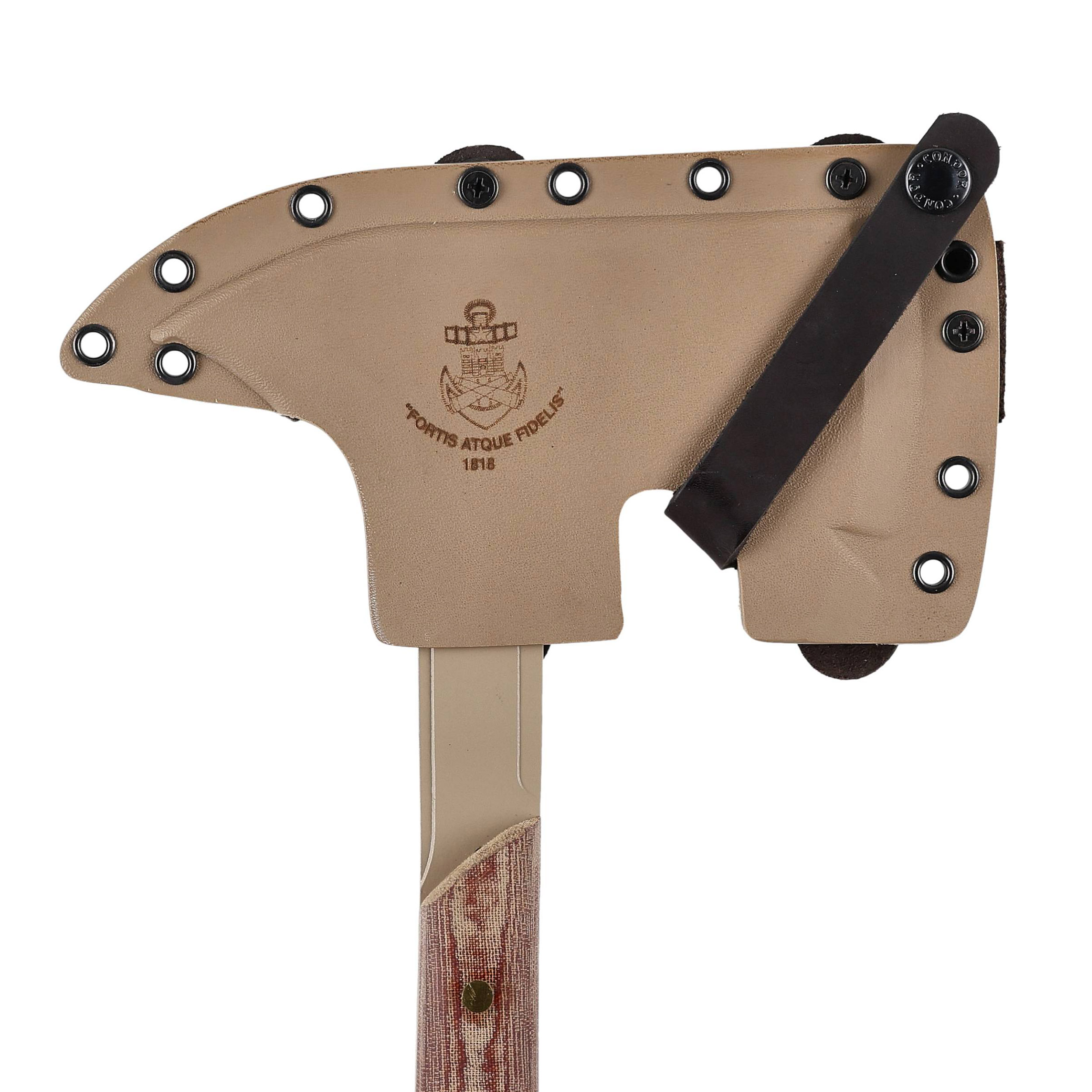 Siekiera Fortis Fidelis dostarczana jest wraz z pochewką na ostrze wykonaną z trwałego Kydexu, który skutecznie zabezpiecza narzędzie w trakcie przenoszenia.