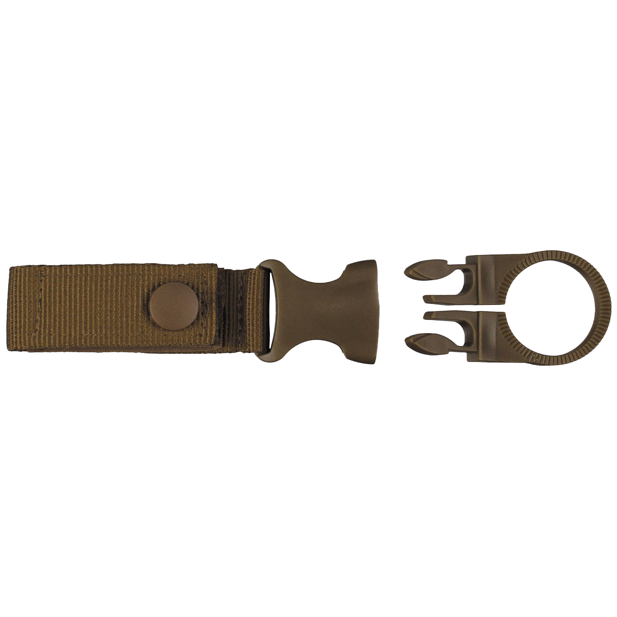 Uchwyt do butelki na wodę PET w standardzie MOLLE / PALS od firmy MFH. Dzięki uchwytowi butelkę można z łatwością troczyć do paska, plecaka, kamizelki czy innego wyposażenia taktycznego lub outdorowego. Uchwyt w kolorze coyote.