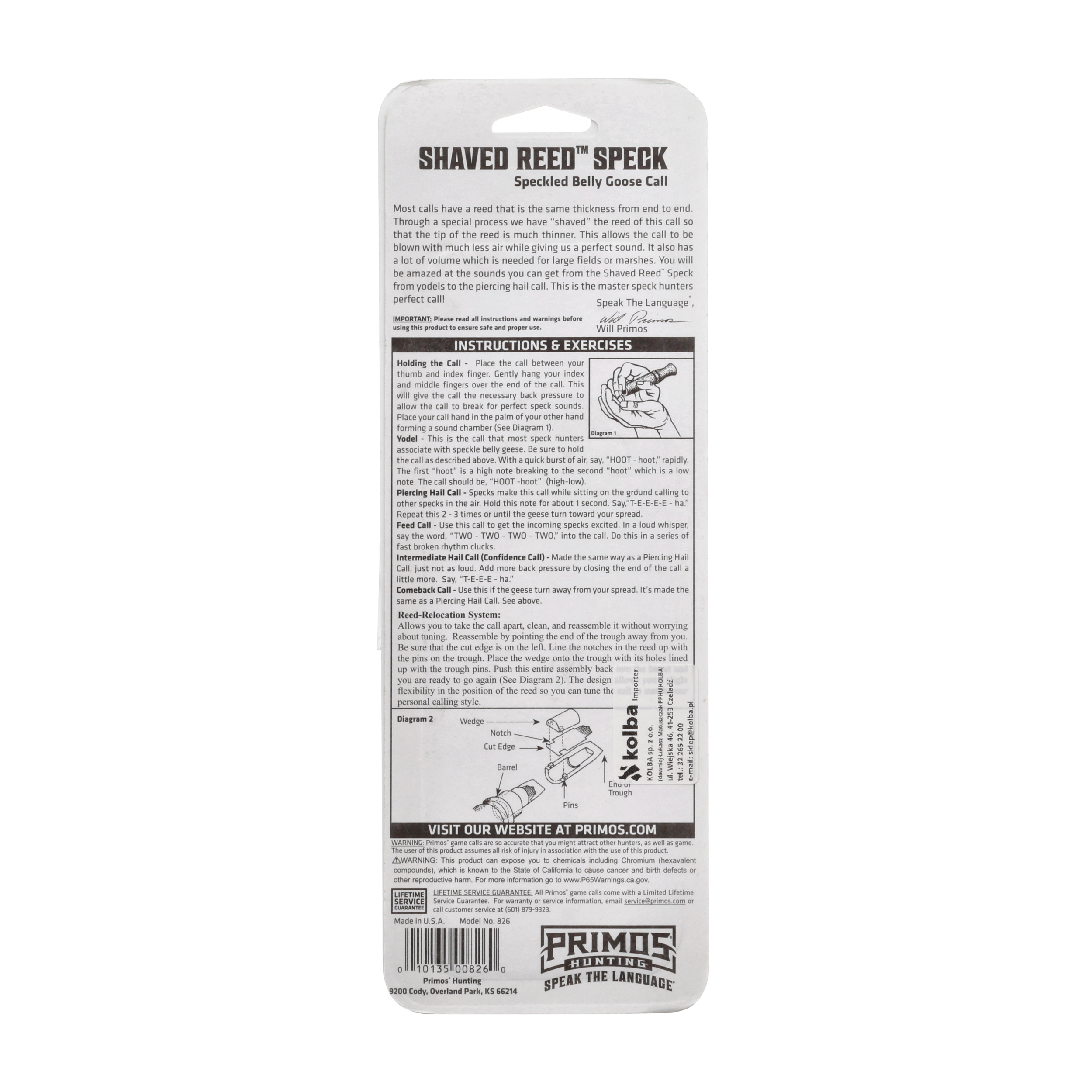 Blaszka membrany o kształcie tulipana ma zmienną grubość od 1 do 3 mm. Duża objętość gwarantuje odpowiednią głośność i zasięg na otwartych przestrzeniach. Primos Shaved Reed Speck dobrze imituje odgłosy gęsi i gęgawy, jest także niezwykle prosty w użyciu.