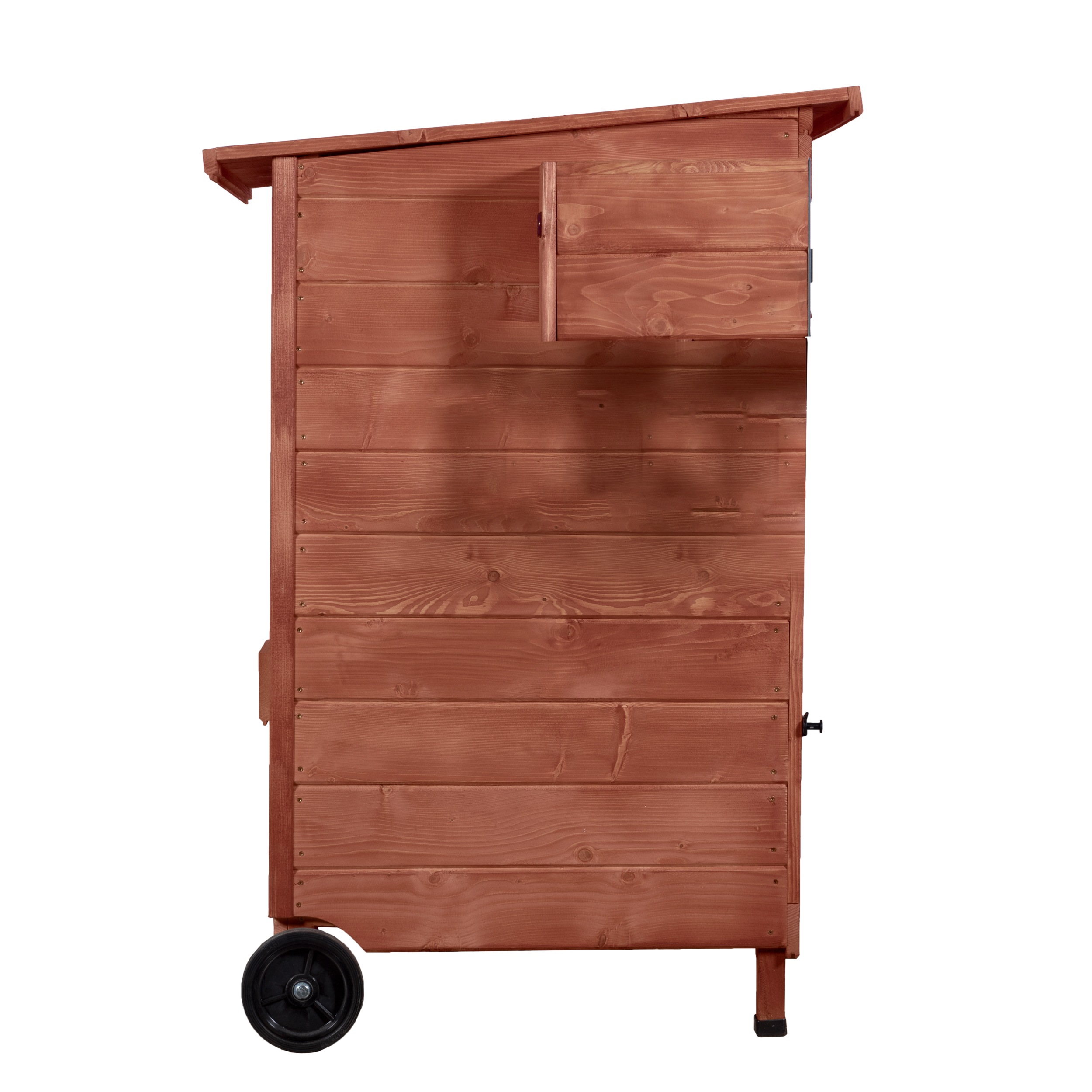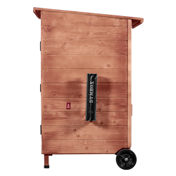 Konstrukcja wędzarni ogrodowej RealHunter została oparta na drewnie, co zapewnia jej estetyczny i łatwo wpasowujący się w otoczenie wygląd. Kompaktowa forma sprawia, że nie będziemy mieli żadnego problemu z rozmieszczeniem naszego urządzenia, a wbudowane kółka umożliwią jego niezwykle łatwy transport. Zostały one zastosowane jedynie po jednej stronie wędzarni – podpórki umieszczone z drugiej zagwarantują nam stabilną pozycję urządzenia nawet na twardej powierzchni.