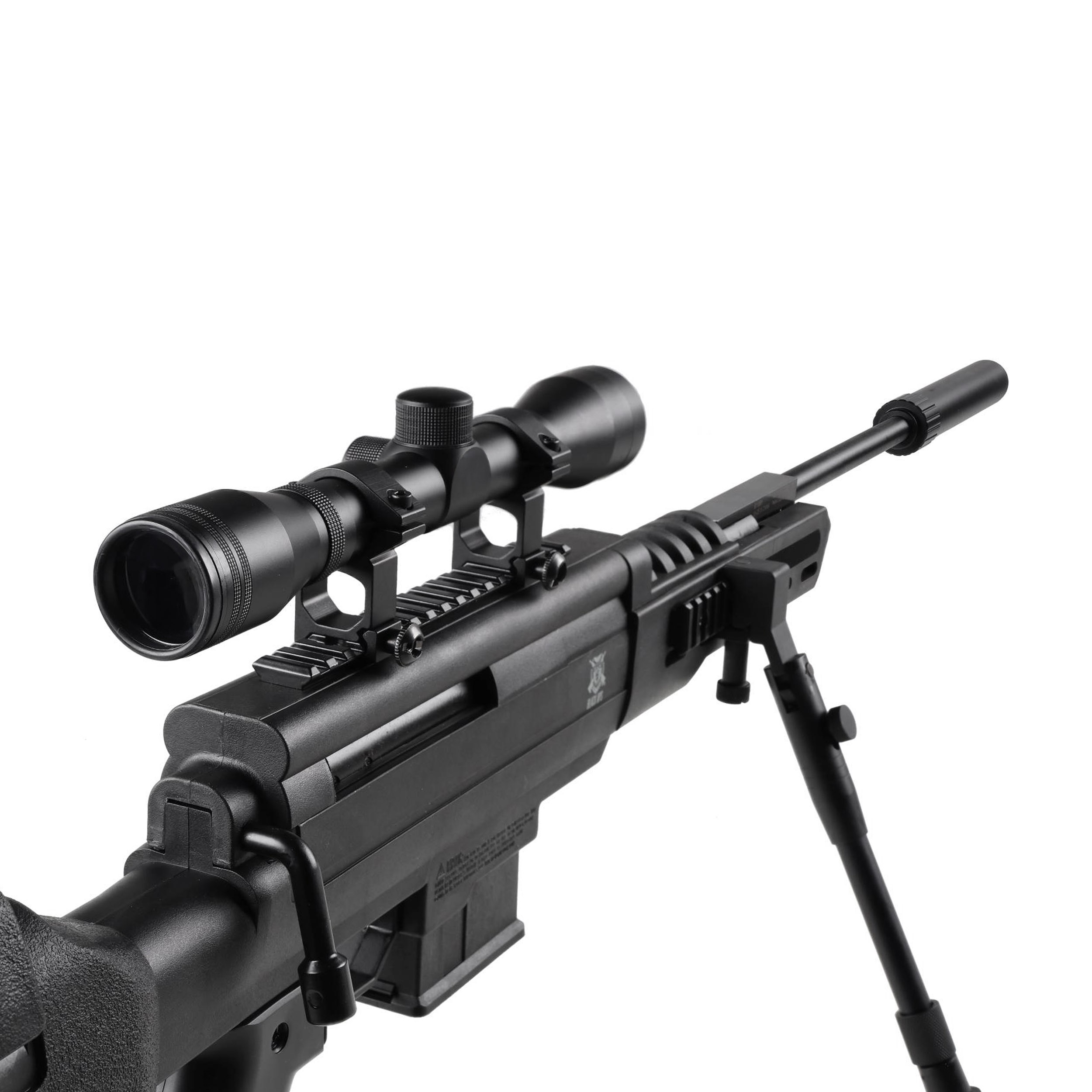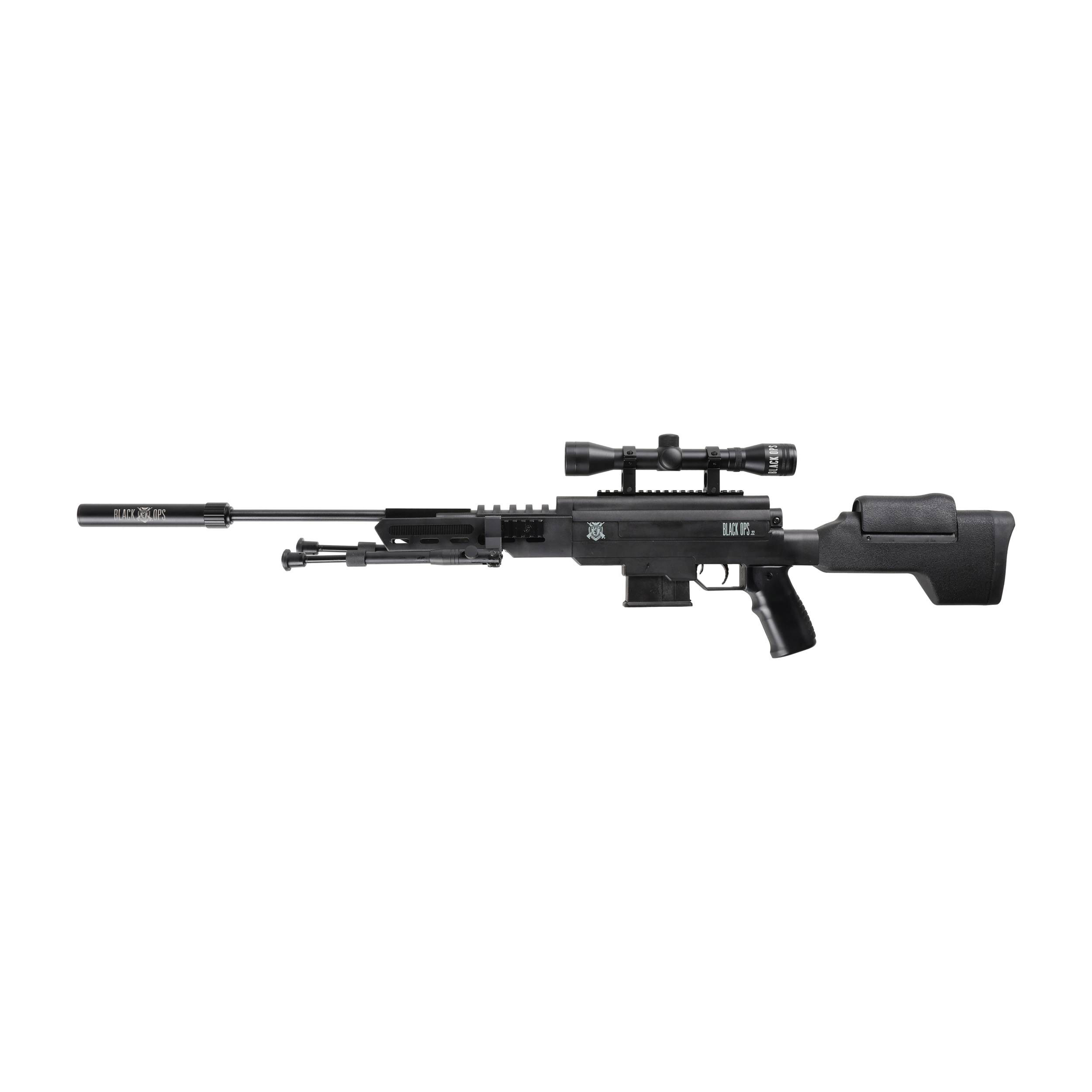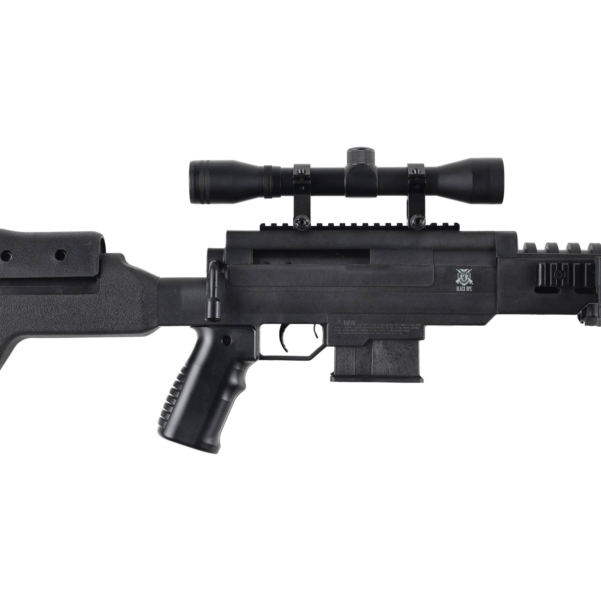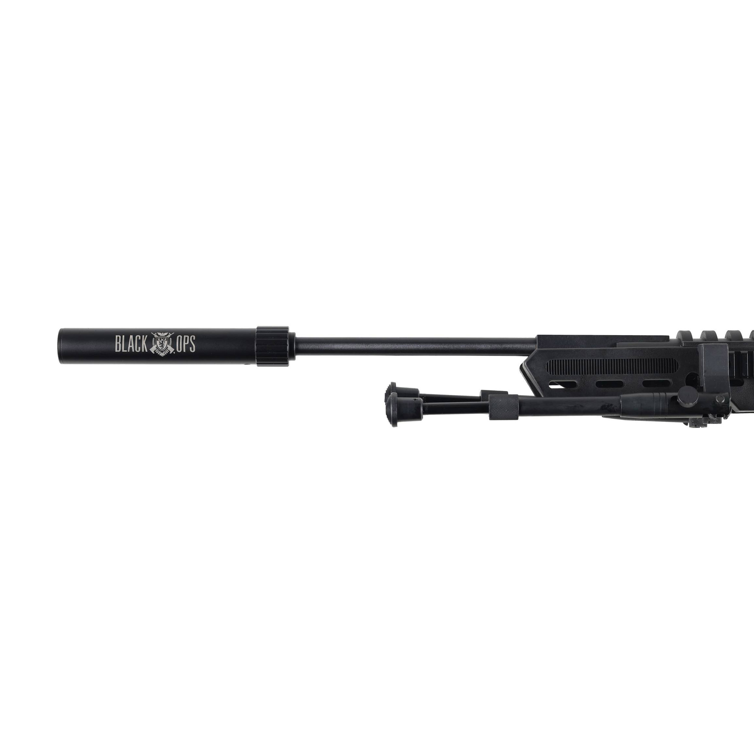 Black Ops Sniper 5,5 mm z lunetą to wiatrówka sprężynowa w taktycznym stylu, wyposażona w nowoczesną polimerową osadę, bakę policzkową o zmiennej wysokości, oraz komplet akcesoriów strzeleckich: dwójnóg, tłumik oraz celownik optyczny 4×32.