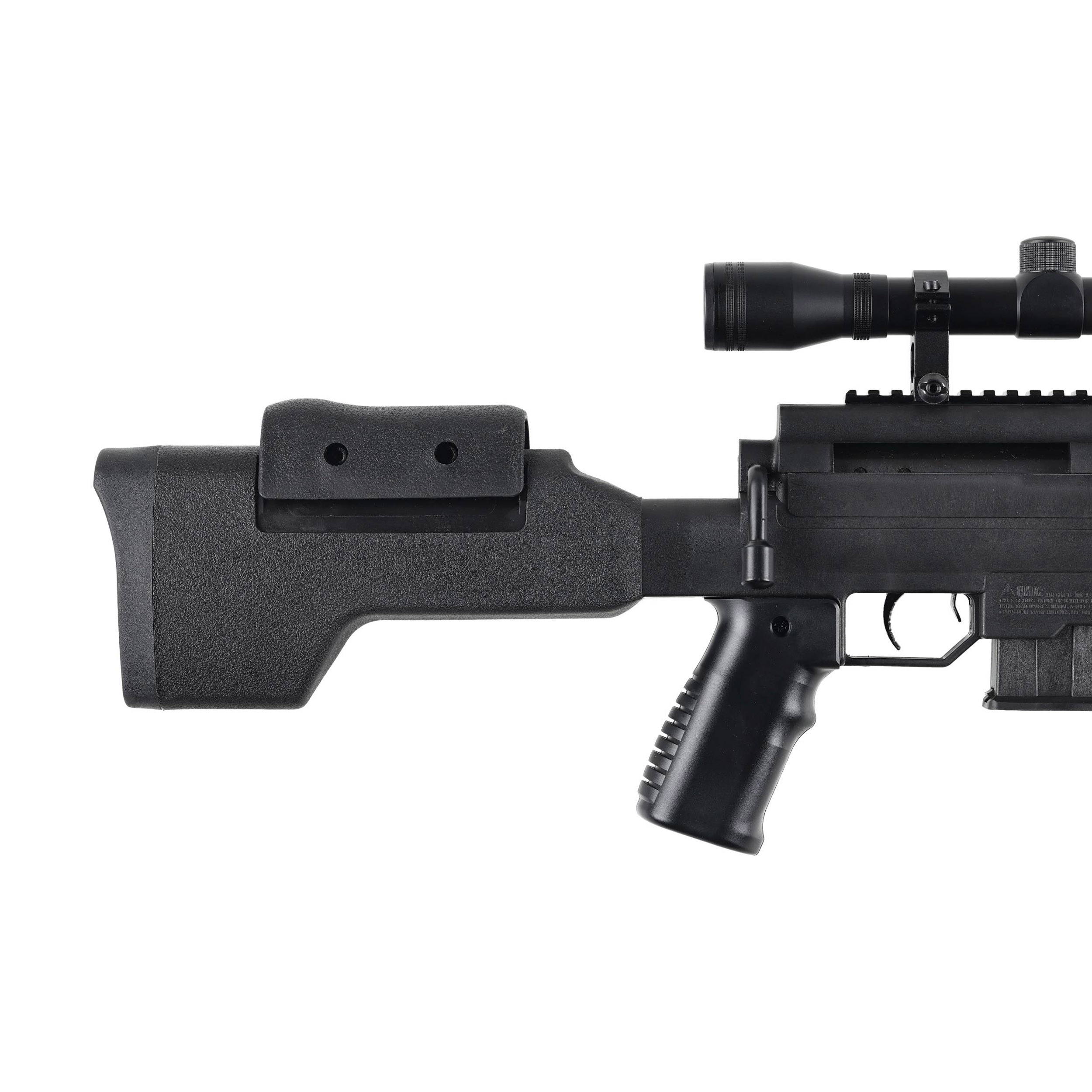 Black Ops Sniper to karabinek wiatrówkowy, który z pewnością przypadnie do gustu pasjonatom broni wojskowej oraz militariów. Taktyczny styl, podkreśla futurystyczne łoże, kolba z regulowaną baką policzkową, boczne szyny akcesoryjne oraz atrapa zamka i magazynka.