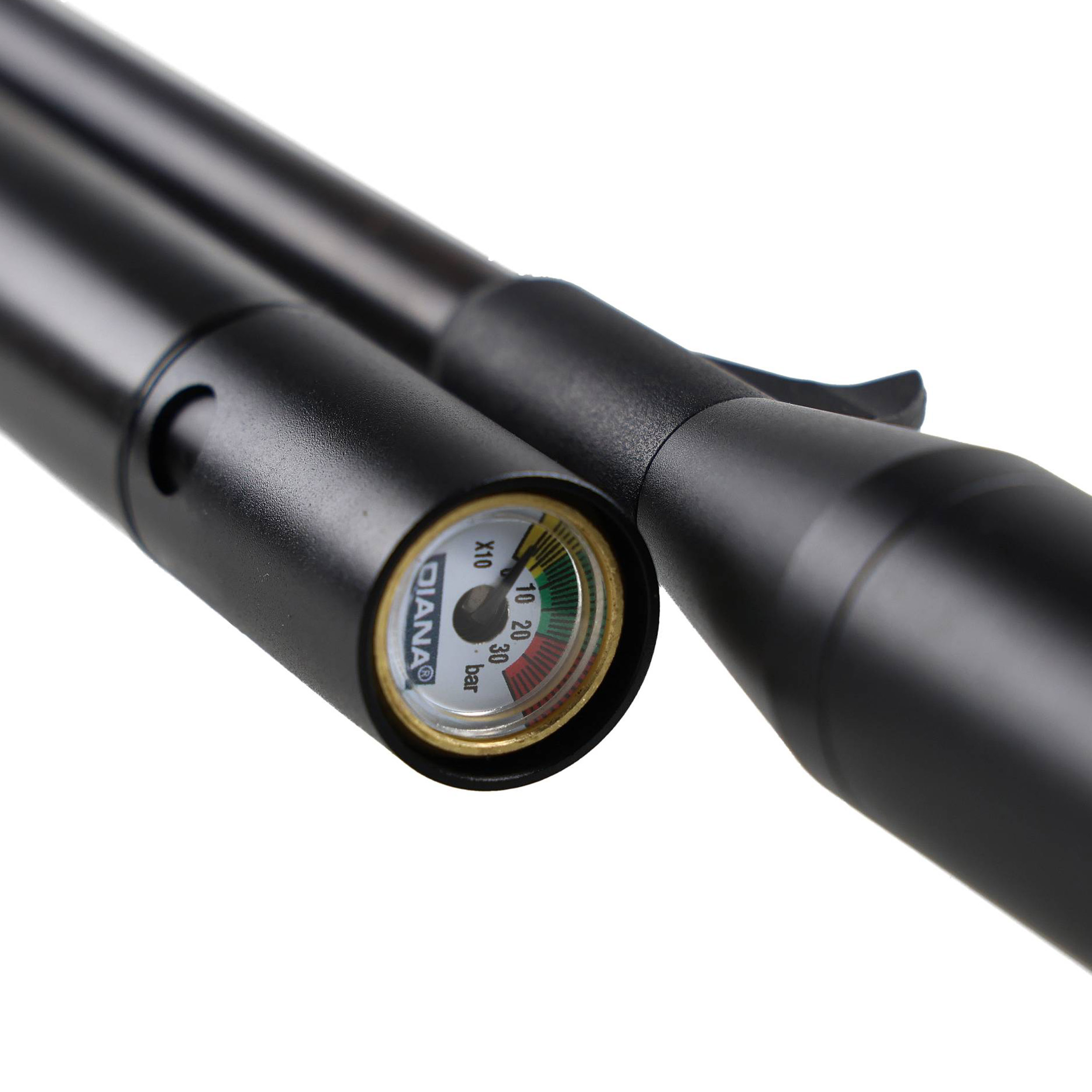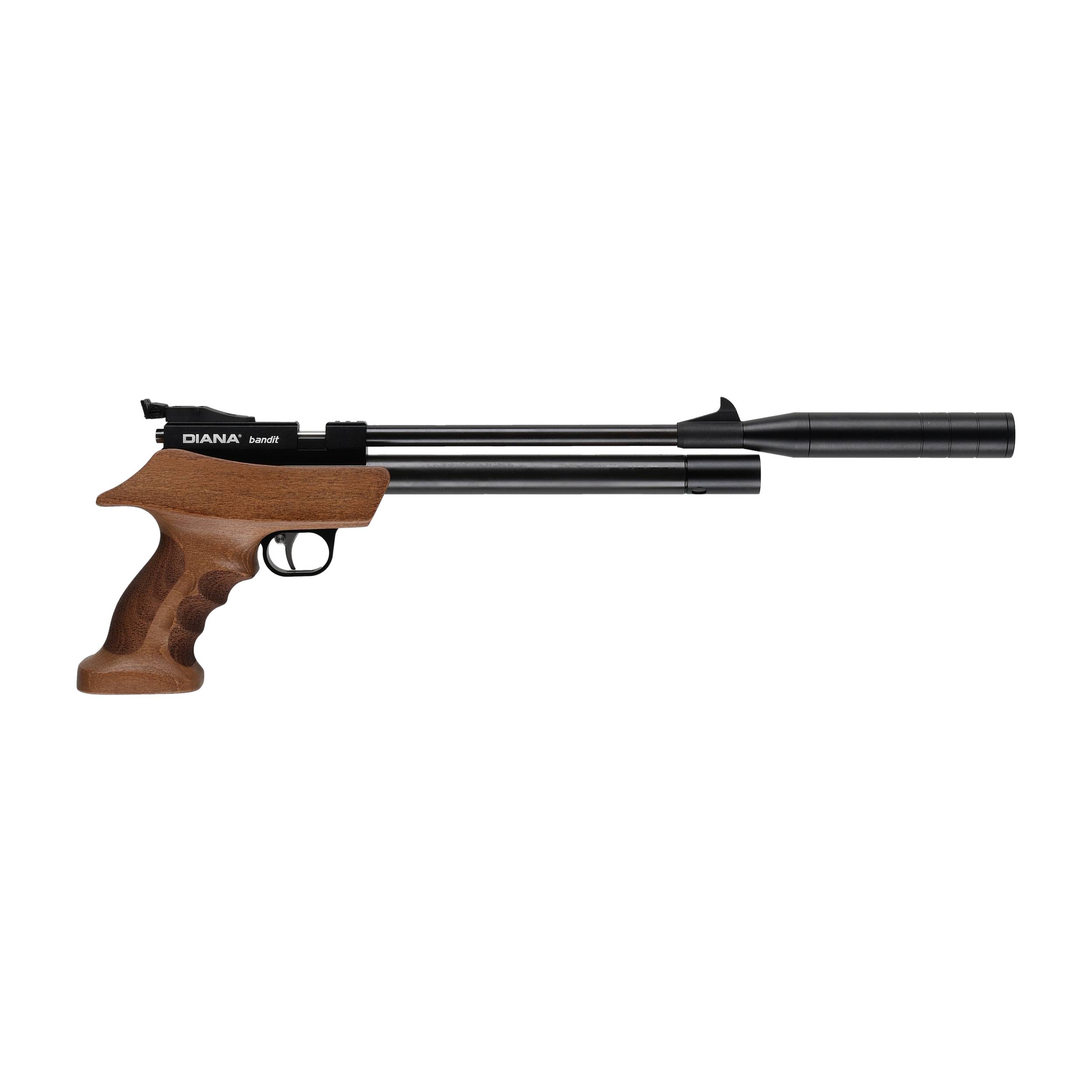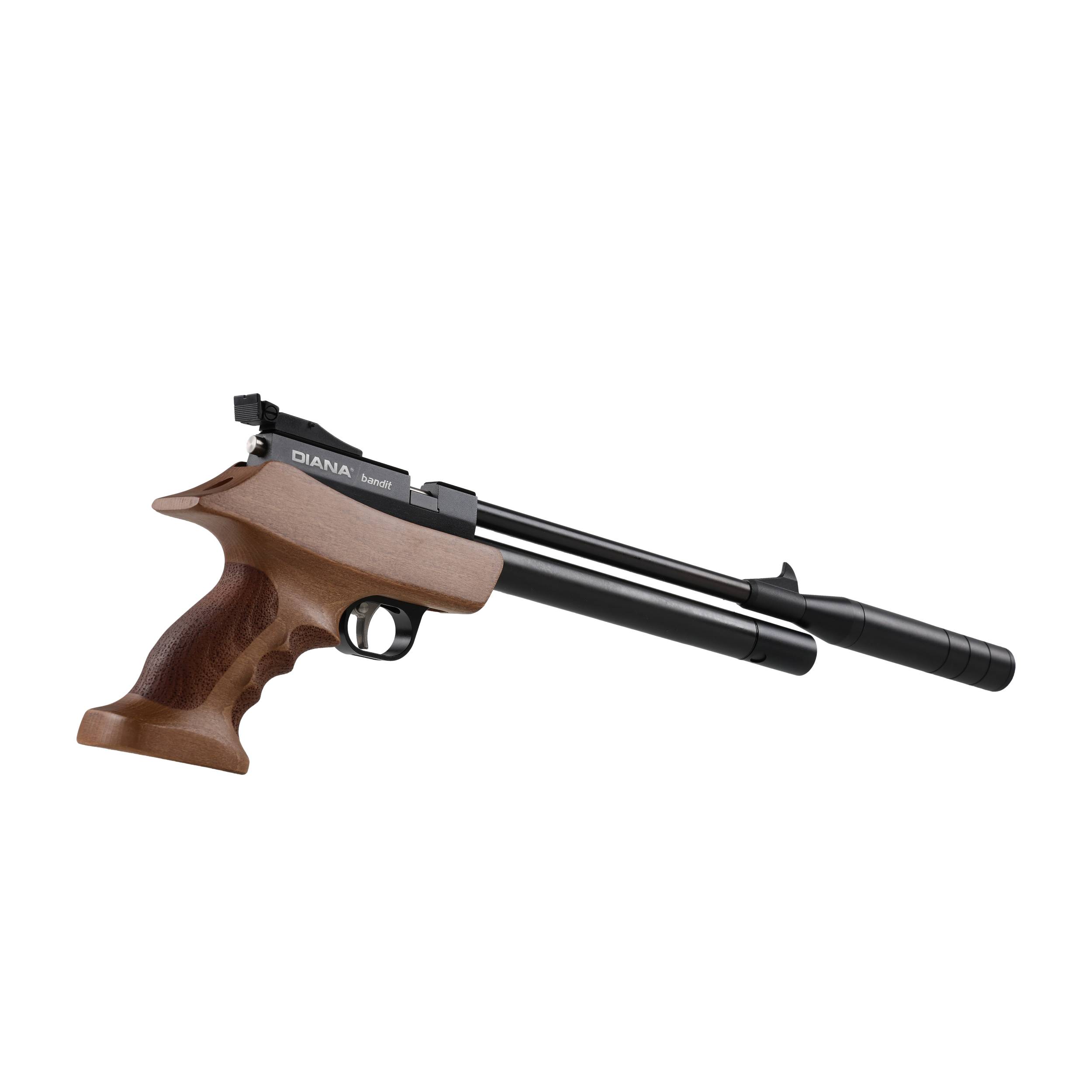 Diana PCP Bandit 5,5 mm ma klasyczną osadę z drewna bukowego, bruzdowaną stalową lufę, mechaniczne przyrządy celownicze oraz szyną 11 mm do montażu celownika optoelektronicznego. Sportowy charakter wiatrówki podkreśla ergonomiczny matchowy chwyt ze stiplingiem i wycięciami na palce. Dzięki takiej funkcjonalności wiatrówka zapewnia stabilny chwyt podczas strzelania z jednej ręki. Pistolet PCP Diana Bandit 5,5 mm zasilany jest sprężonym powietrzem magazynowanym w aluminiowym kartuszu o pojemności 50 cc, zamocowanym pod lufą. Z kartusza napełnionego do maksymalnego ciśnienia 200 Bar możemy oddać ok. 15 strzałów o równej prędkości początkowej do 200 m/s. Zintegrowany manometr ułatwia odczyt ciśnienia w kartuszu, dzięki czemu szybko ocenić jakim zapasem powietrza dysponujemy. Port ładowania zabezpiecza przed zabrudzeniem obrotowa osłona z aluminium. Gazowy napęd pcp sprawia, że wiatrówka po oddaniu strzału nie generuje żadnego odrzutu, co wpływa na komfort i precyję strzelania.