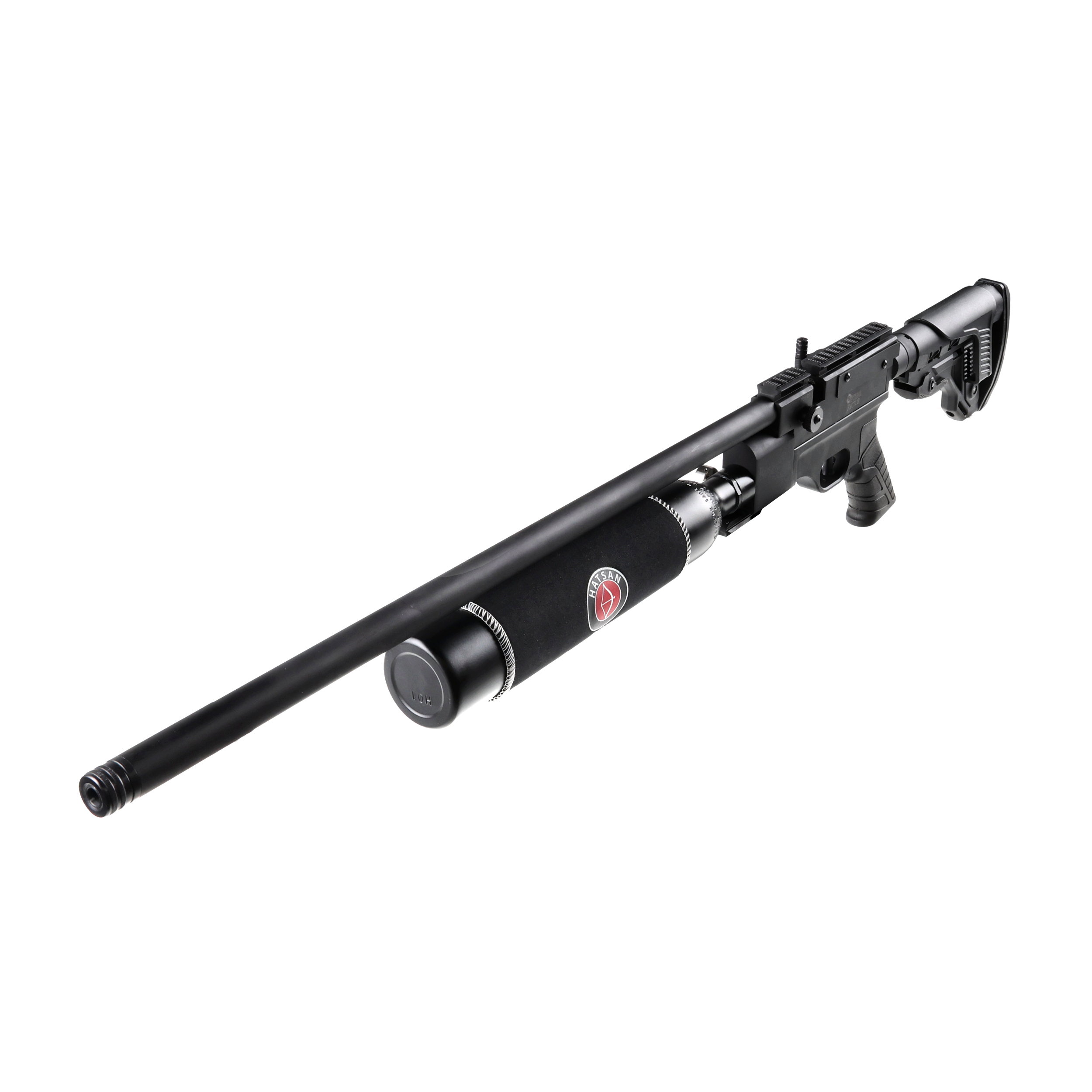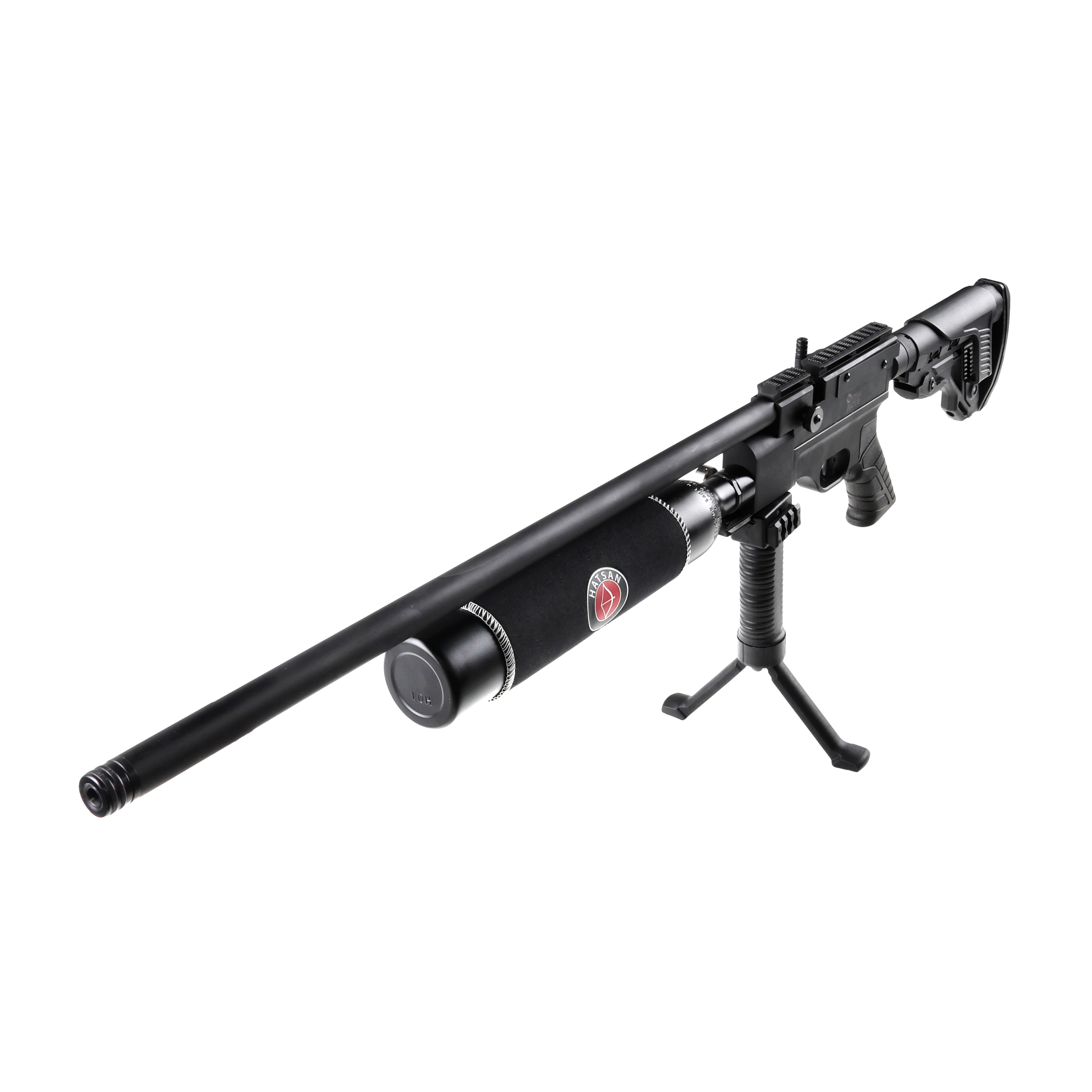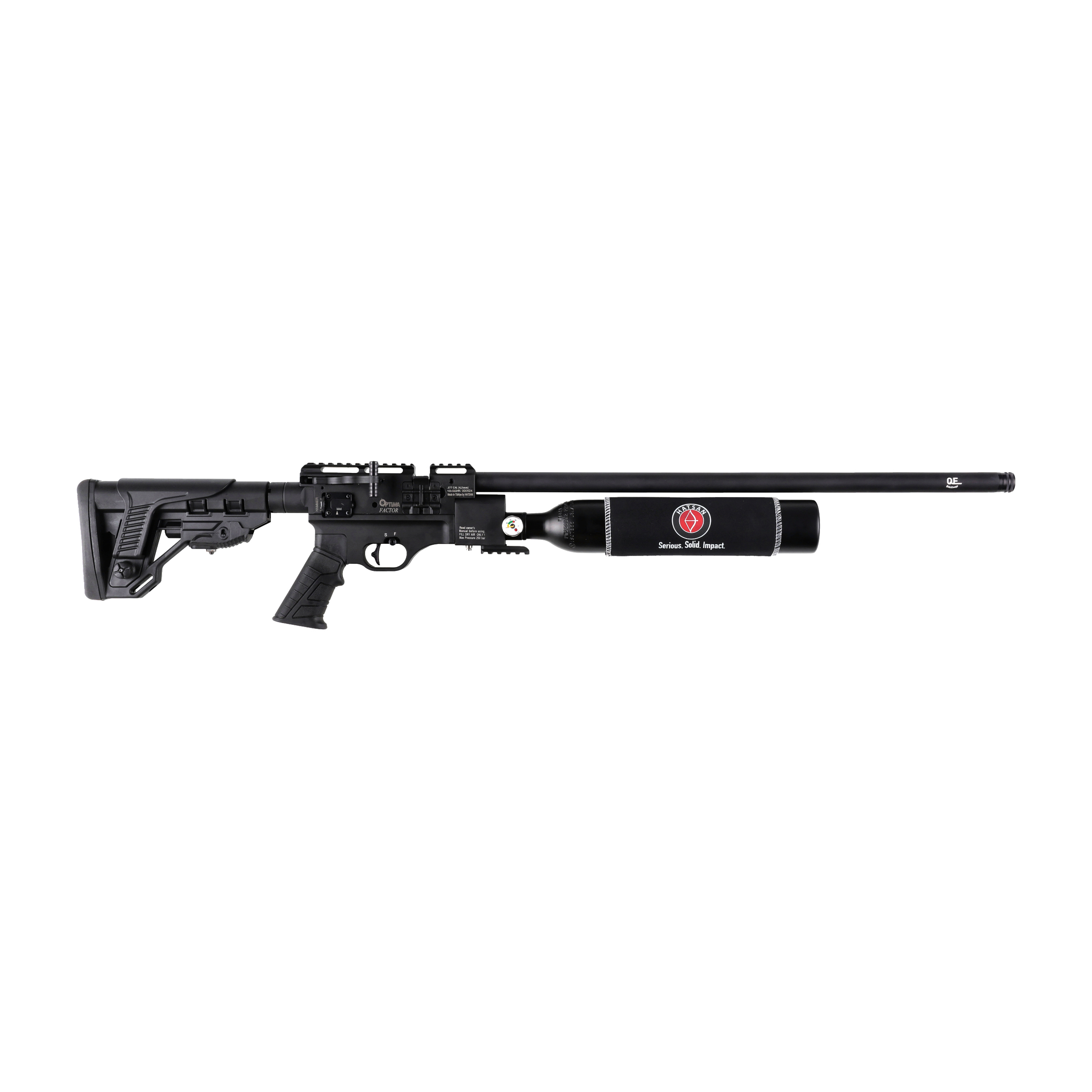 Optima by Hatsan Factor 4,5 mm to karabinek PCP w militarnym stylu, wyposażony w precyzyjną czokowaną lufę, taktyczną kolbę z regulowaną stopką oraz 2-stopniowy mechanizm spustowy z regulacją języka spustowego.