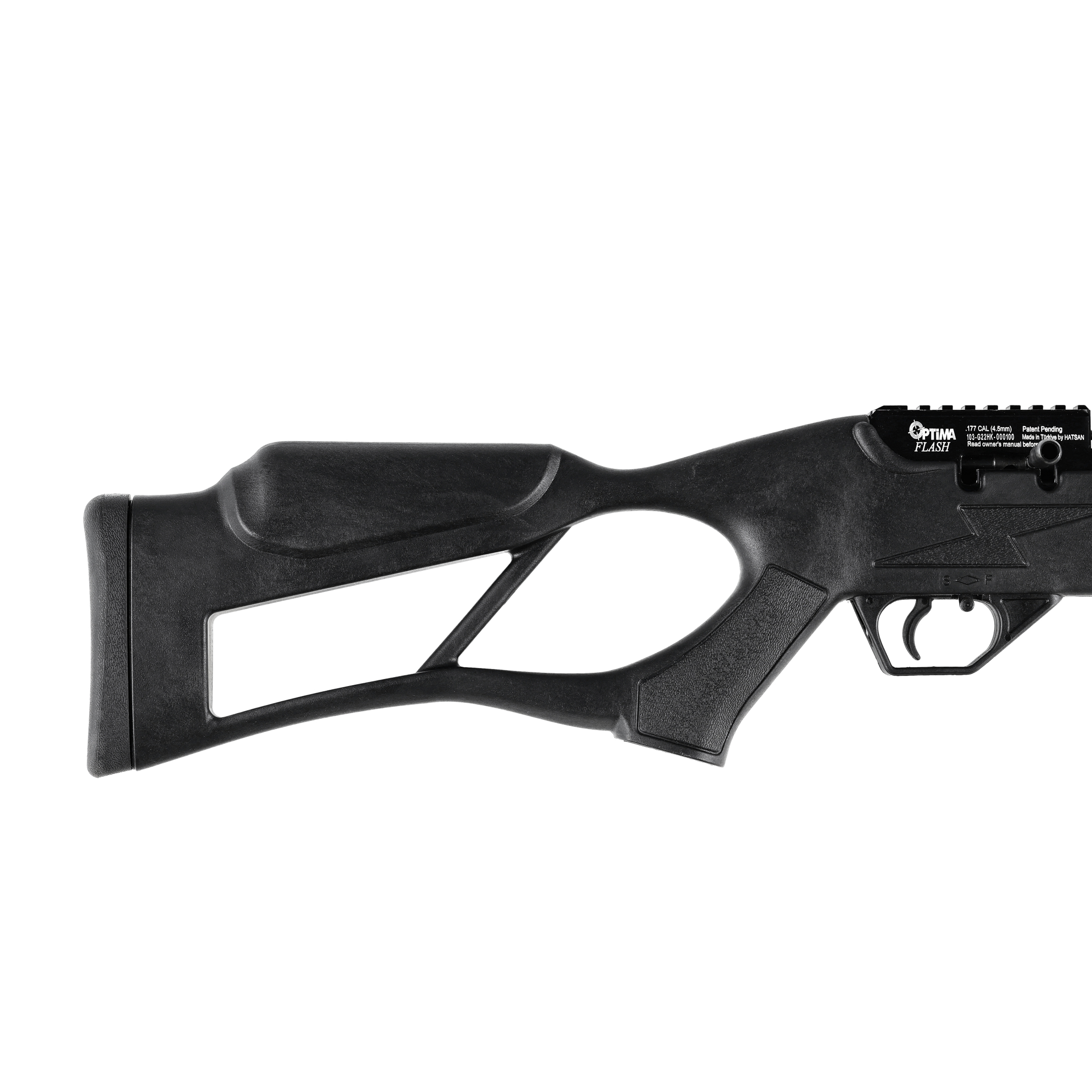 Wiatrówka Optima by Hatsan Flash ma zwartą konstrukcją, dzięki czemu karabinek jest bardzo składny, pasuje do dużej grupy strzelców oraz jest wygodny w transporcie. Polimerowa osada została zaprojektowana z naciskiem na ergonomię i wygodę oddania strzału. Ryflowany chwyt pistoletowy zwiększa kontrolę i ułatwia operowania karabinkiem. Dzięki zastosowaniu polimerowej osady karabinek jest stosunkowo lekki, a konserwacja osady ogranicza się głównie do utrzymywania jej w ogólnej czystości. Profilowana baka policzkowa Monte Carlo jest symetryczna, umożliwiając komfortowe strzelanie osobom prawo i leworęcznym. Gumowa stopka odczuwalnie zmniejsza odrzut po strzale oraz tworzy stabilny punkt oparcia.
