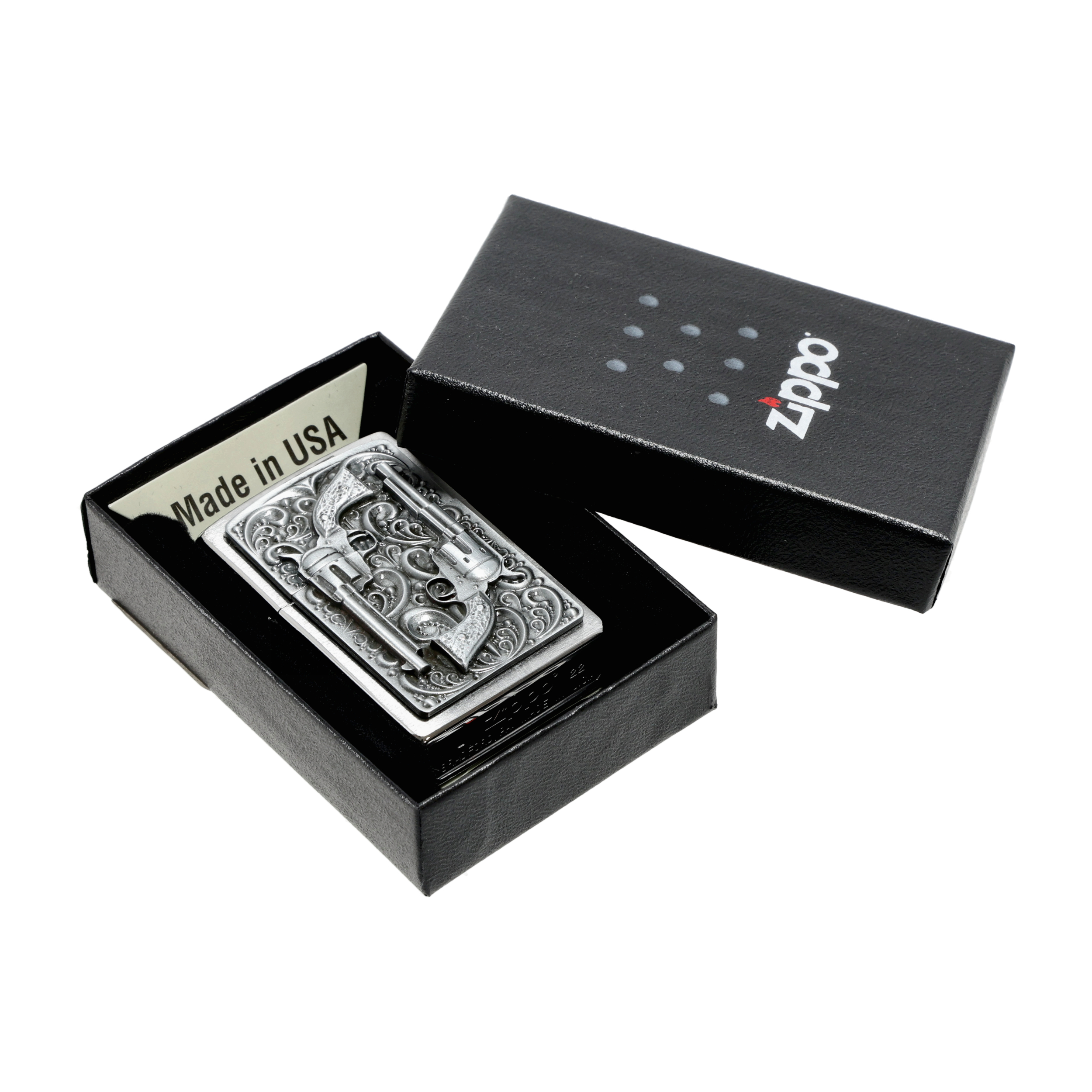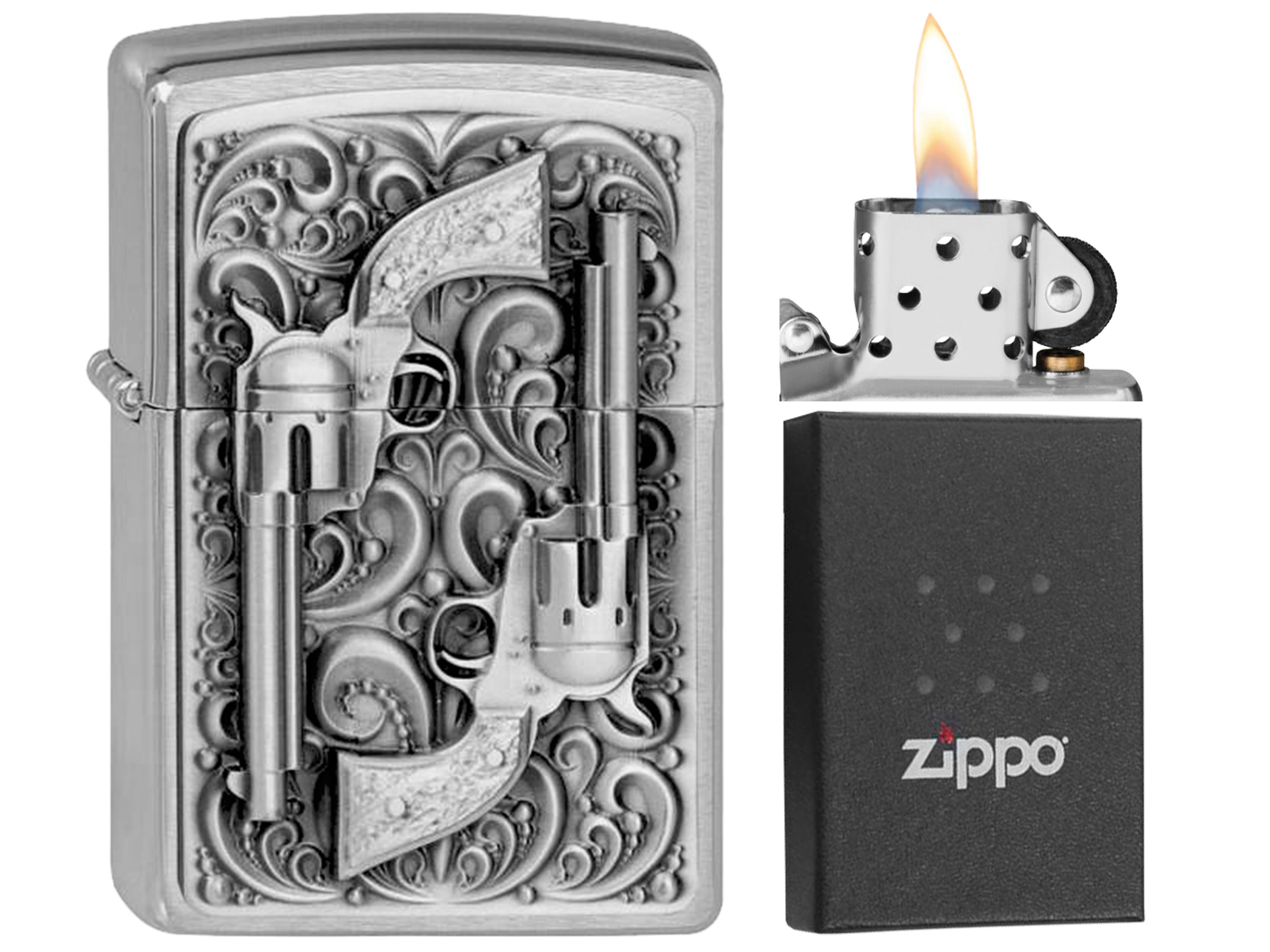 Zapalniczka benzynowa Zippo to prawdziwa ikona wśród tego typu urządzeń, będąca wręcz synonimem zasilanego benzyną modelu. Wysoka niezawodność, doskonała jakość wykonania oraz skuteczne zabezpieczenie płomienia przed wiatrem sprawiają, że zapalniczki Zippo cieszą się niesłabnącą popularnością od czasów Drugiej Wojny Światowej, kiedy to służyły amerykańskim żołnierzom w trudnych warunkach walk na Pacyfiku. Już teraz możesz skorzystać z nieocenionych zalet tego ikonicznego produktu w wersji wizualnej, która będzie najlepiej wyrażała Twoją osobę. Omawiany model został ozdobiony kowbojskim motywem rewolwerów.