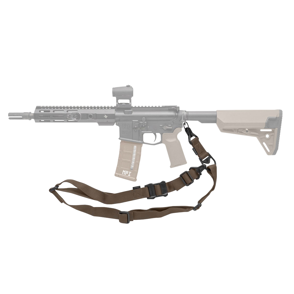 W konstrukcji zawieszenia zastosowano dwa rodzaje klamer, dla uzyskania optymalnej pracy akcesorium. Klamra Magpul Paraclip charakteryzuje się nie tylko znaną z produktów firmy wytrzymałością, ale również niezwykłą wygodą obsługi. Podnoszona za pomocą dźwigni zapadka pozwala na błyskawiczne przepięcie zawieszenia z pozycji jednopunktowej w dwupunktową. Duża powierzchnia przycisku ułatwia obsługę w rękawicach, a przetykowa blokada daje nam 100% pewności, że zawieszenie nie odepnie się w najmniej oczekiwanym momencie. Popularny system umożliwia błyskawiczne odłączenie karabinka w sytuacji awaryjnej. Dla ponadprzeciętnej trwałości korpus klamry został pokryty niezwykle wytrzymałą powłoką chemiczną Melonite.