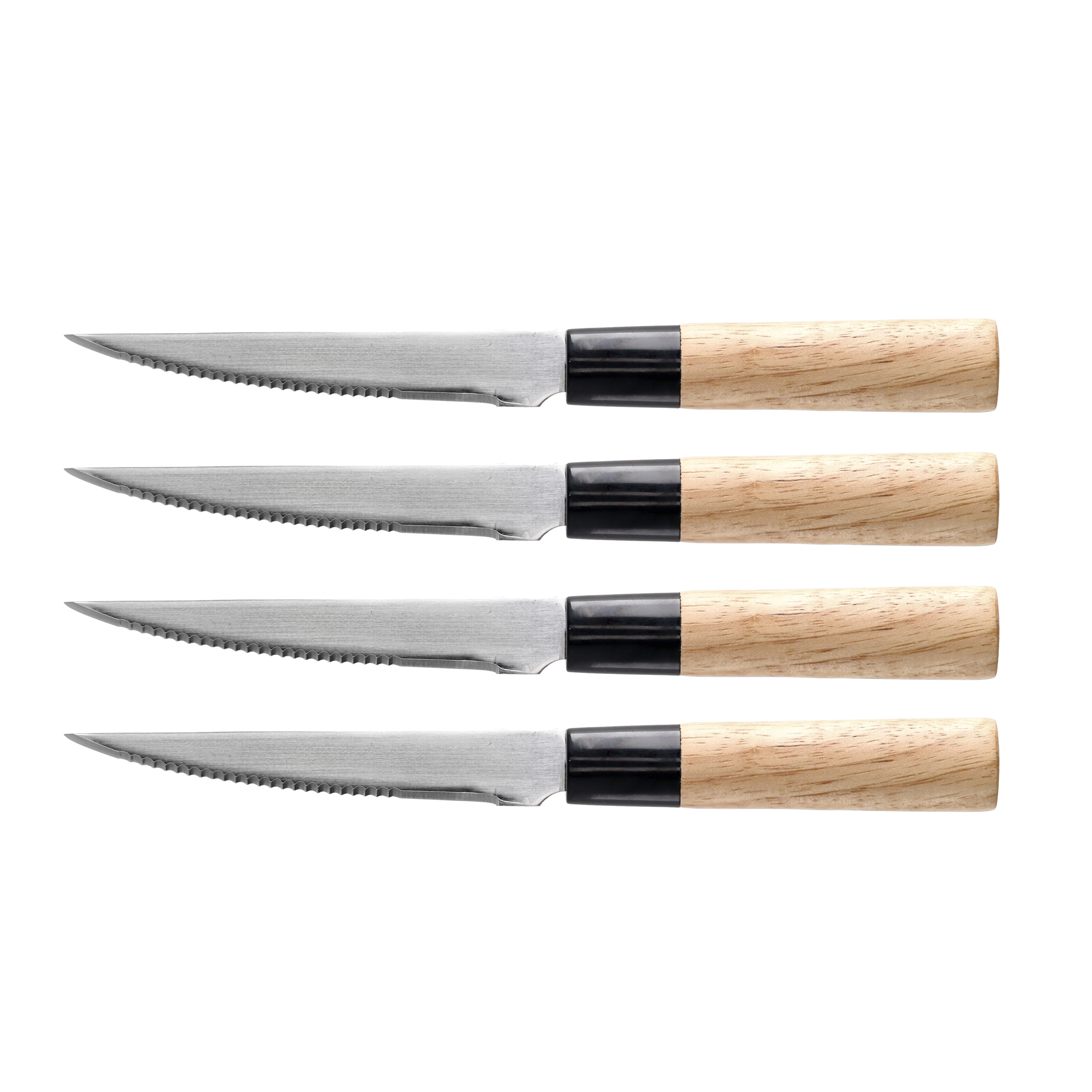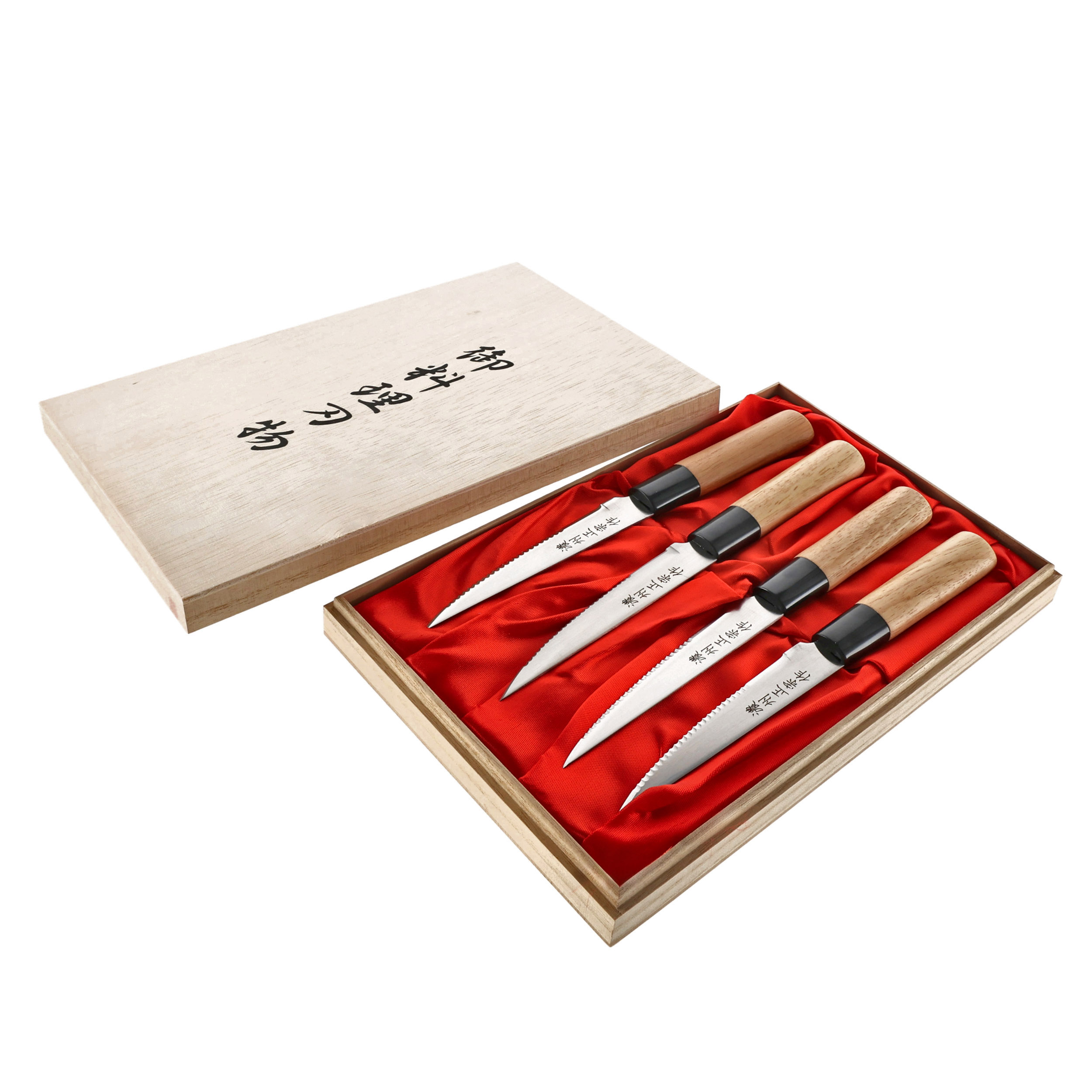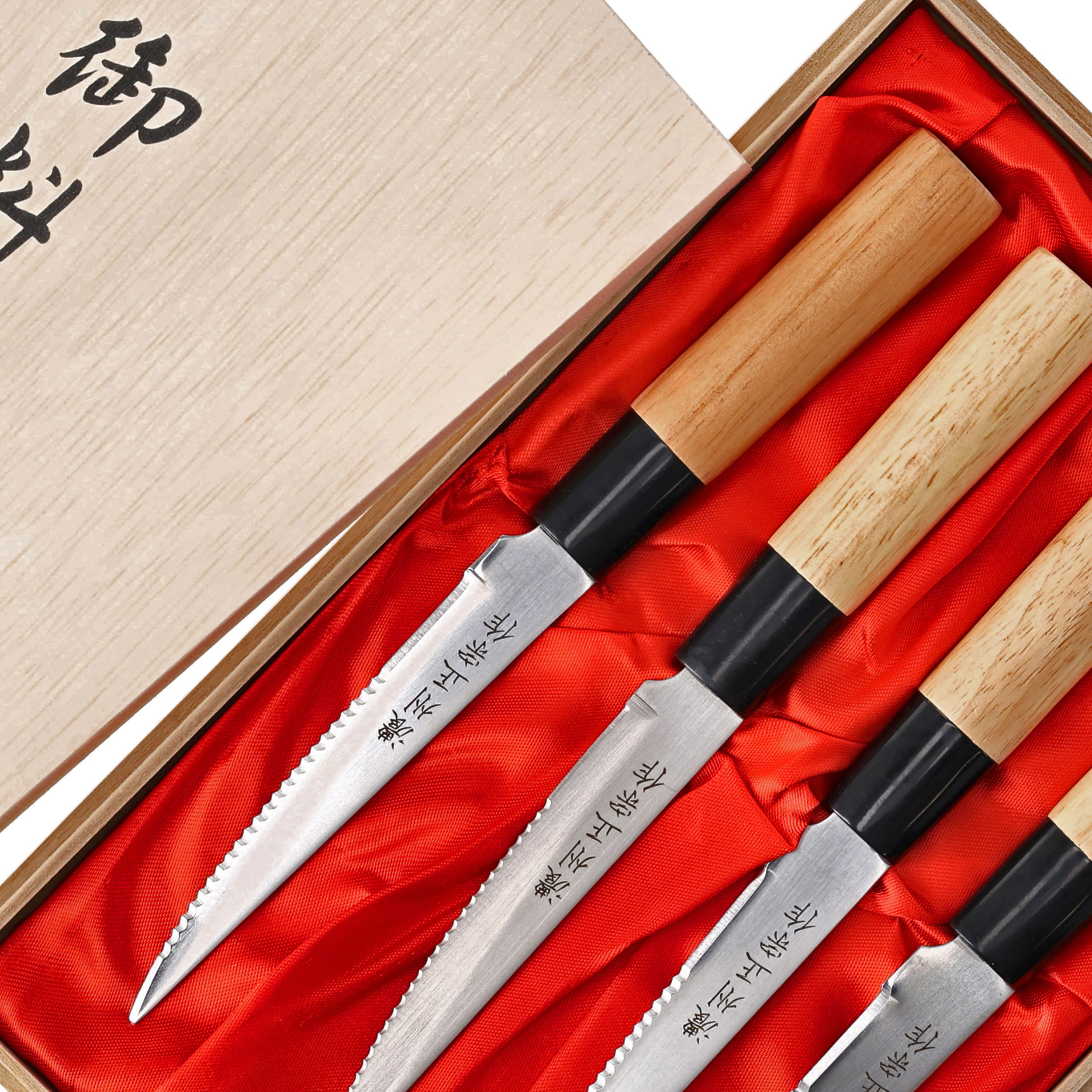 Nóż ma lekką rękojeść o okrągłym profilu, wykonaną z polerowanego drewna magnolii. Polimerowy pierścień pewnie blokuję klingę w rękojeści, która została zmocowana metodą tradycyjną tj. na wcisk. W komplecie znajdują się 4 noże pakowane do drewnianego pudełka z delikatnym materiałowym wypełnieniem.