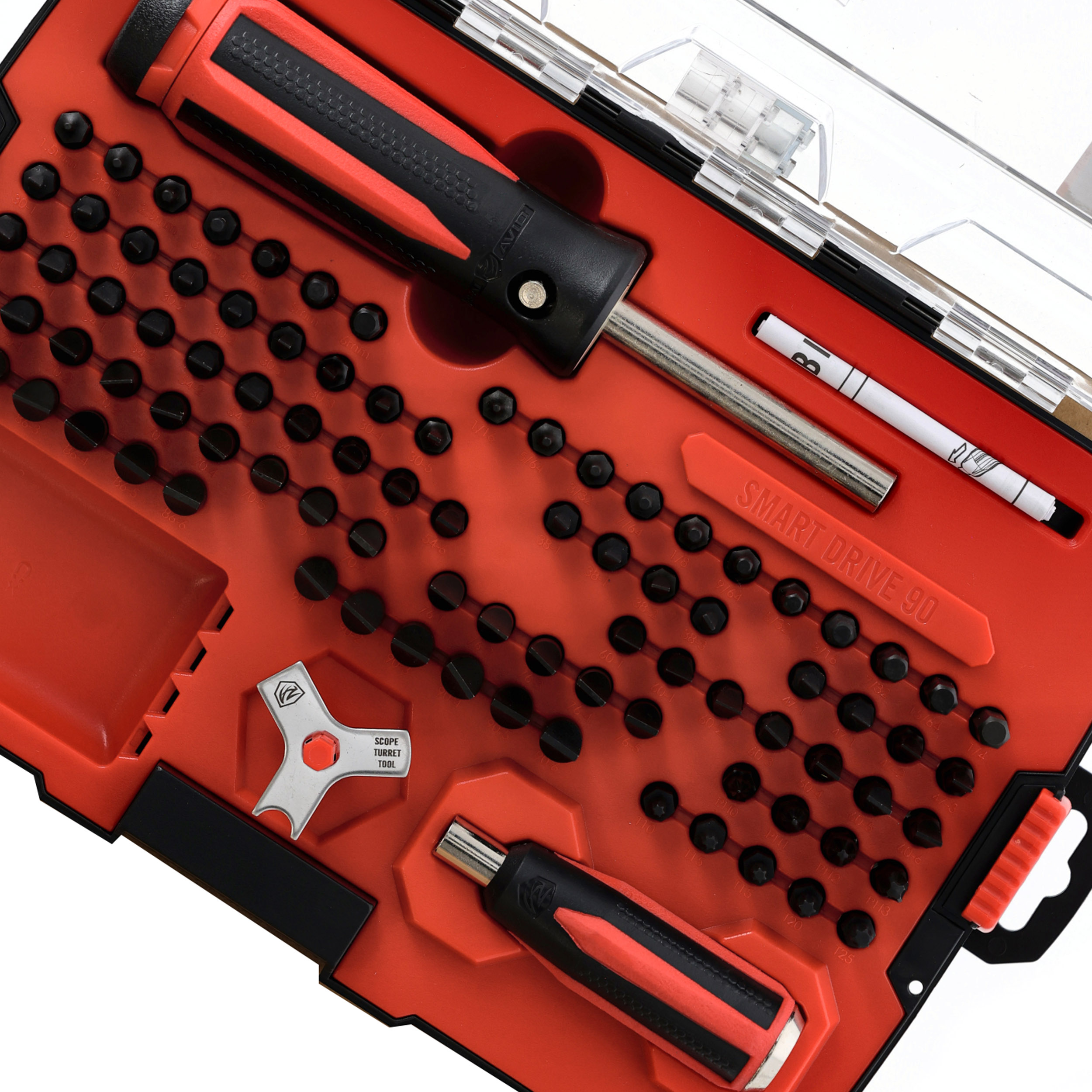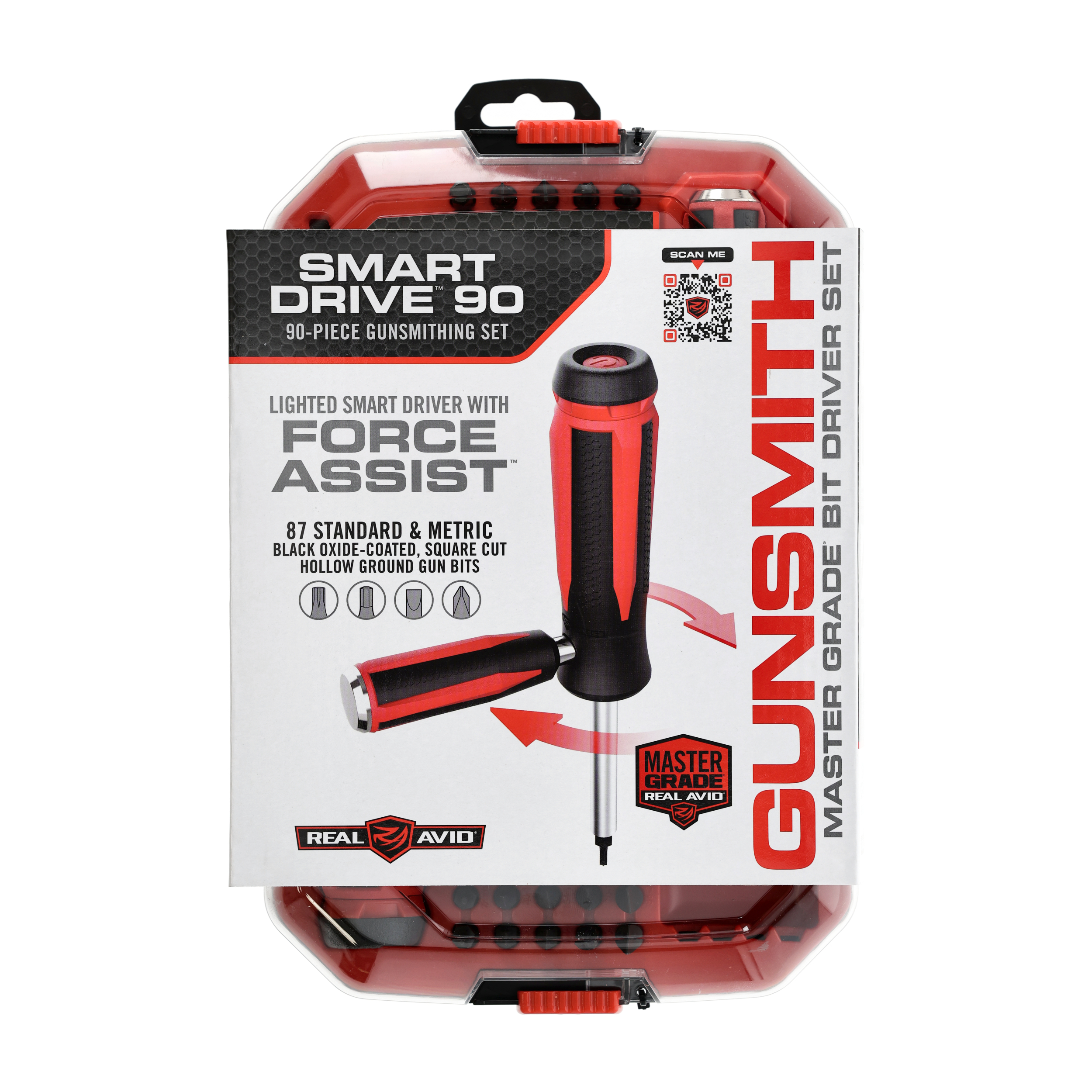 Zestaw śrubokrętów Real Avid Smart Drive 90 Gunsmith Bit Driver Set w skład którego wchodzi duży oraz mały śrubokręt z magnetyczną końcówką, oraz zestaw 87 bitów wykorzystywanych w konserwacji i serwisowaniu broni palnej. Całość mieści się w wytrzymałym pudełku z tworzywa, które ma magnetyczną tackę, chroniącą drobne metalowe elementy przed przypadkowym zgubieniem.